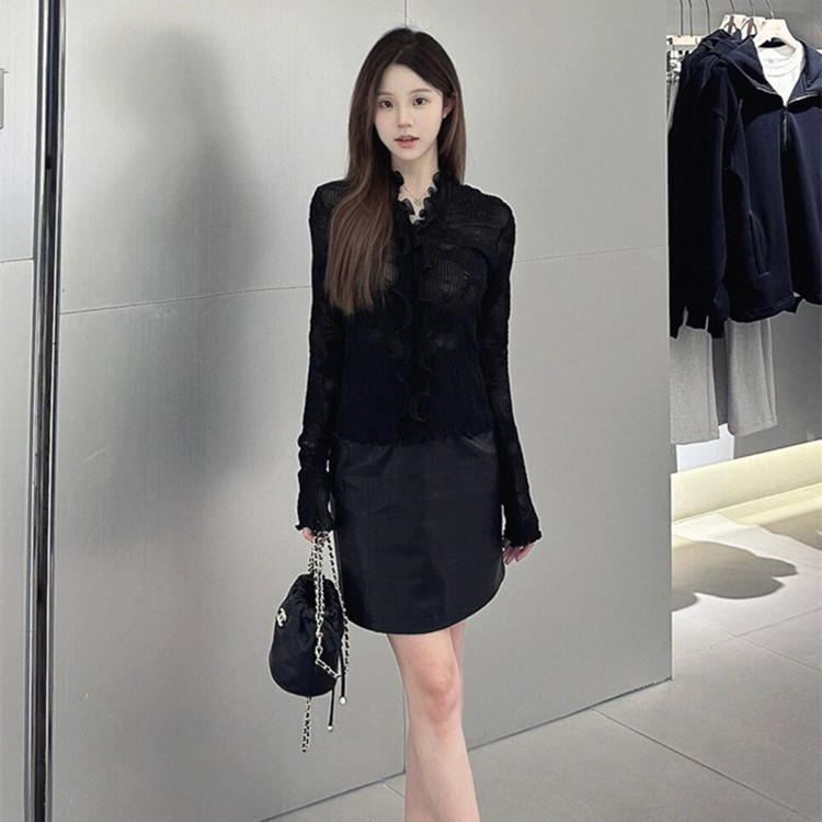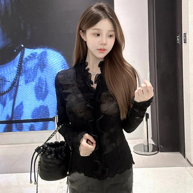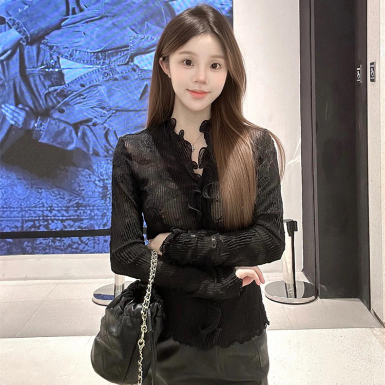法式气质V领木耳边蕾丝长袖衬衫女秋冬内搭打底衫设计感收腰上衣