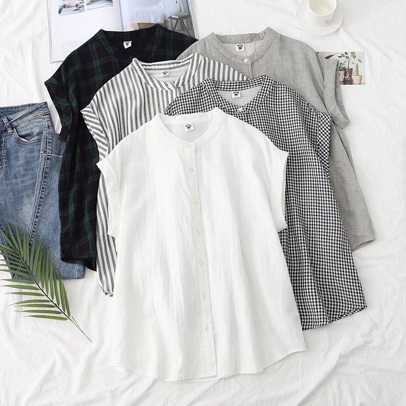 温言 日系夏新棉麻风女立领宽松翻边短袖双层棉纱衬衫无袖衬衣