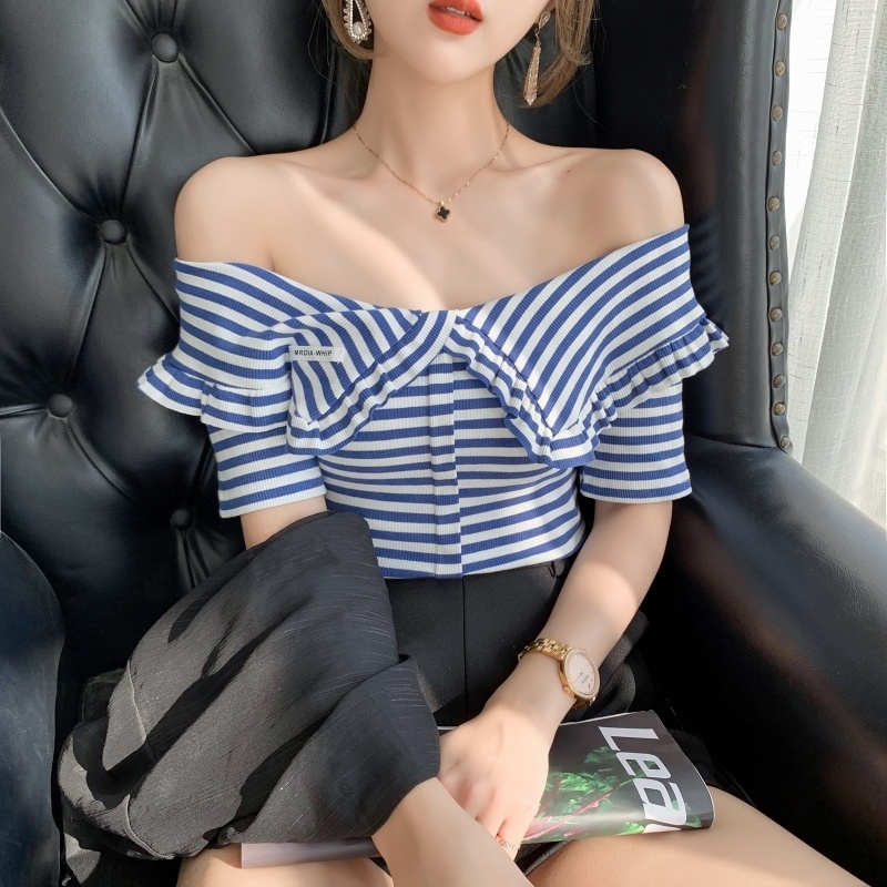条纹短袖t恤女2024新款夏季修身设计感小众一字领露肩短款上衣女