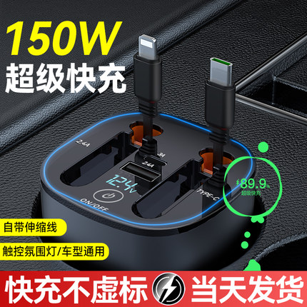 车载充电器超级快充线杯式逆变伸缩一拖三适用于PD苹果华为转换头