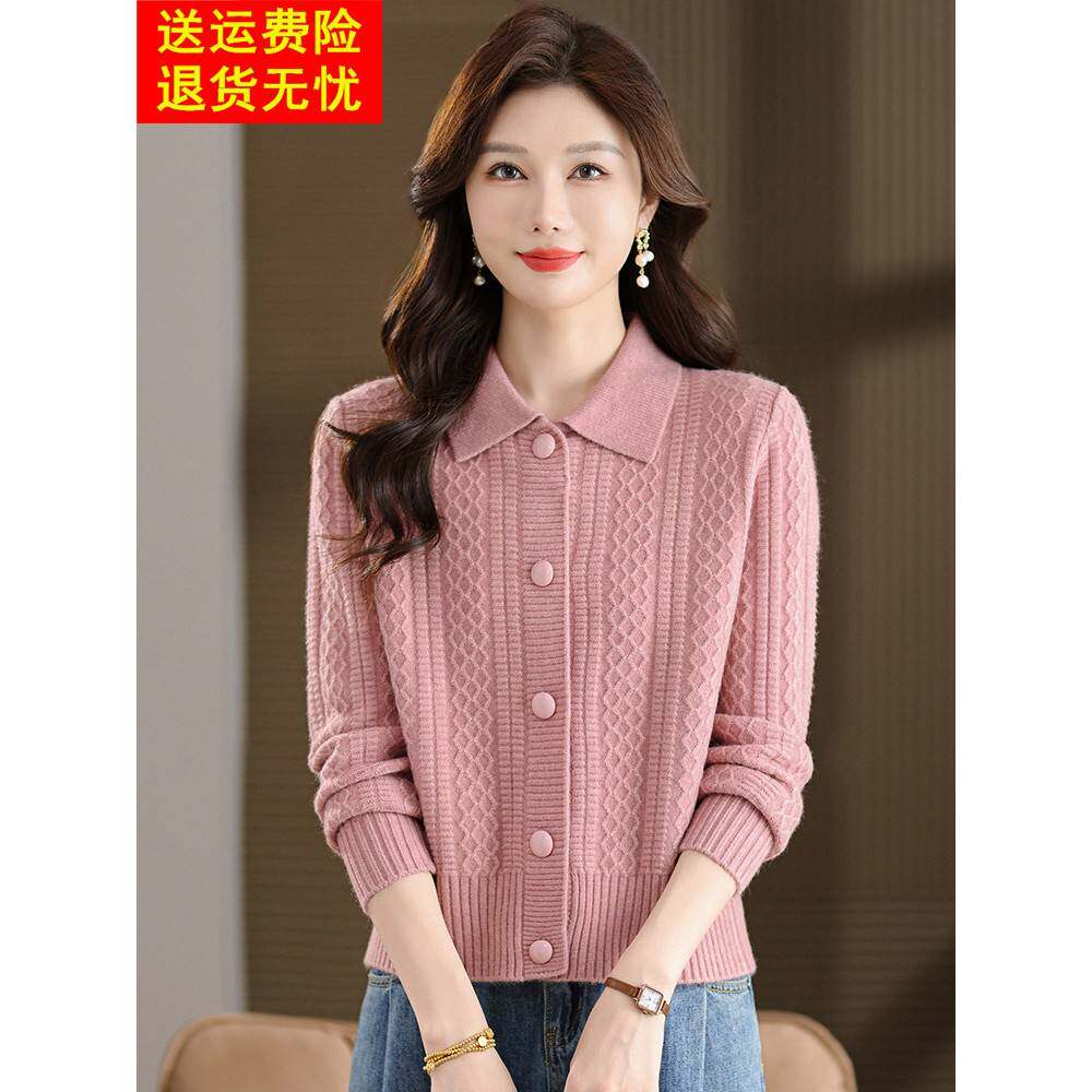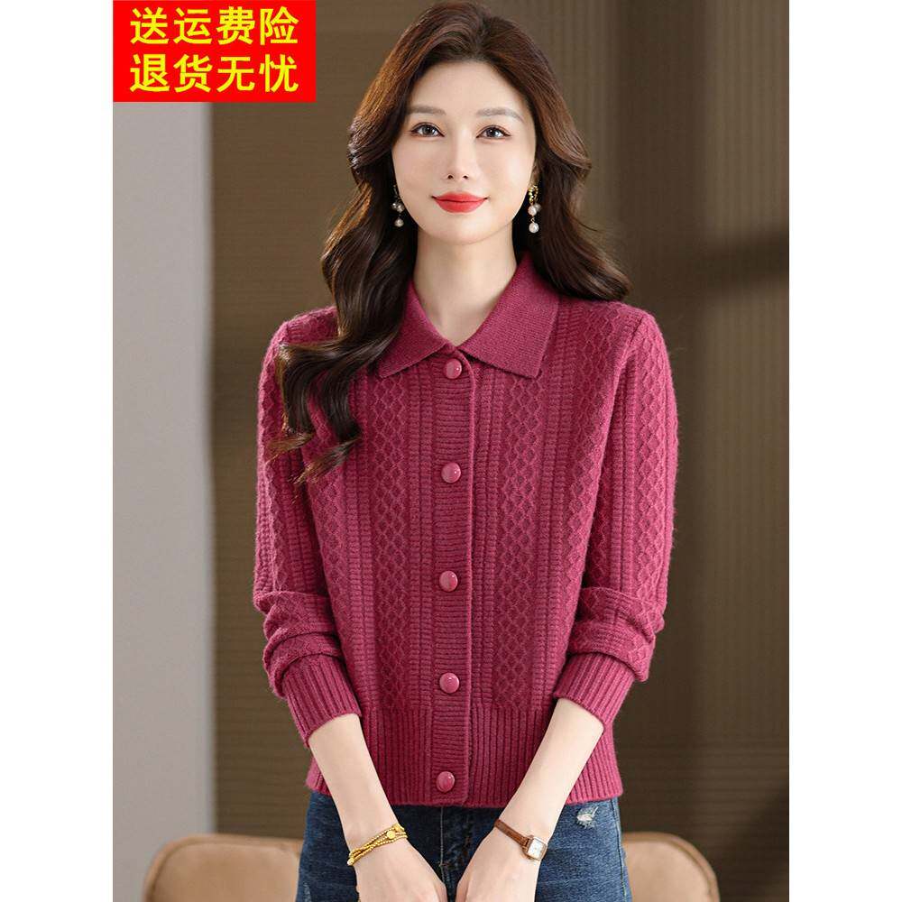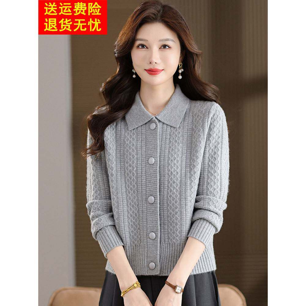 鄂尔多斯市短款翻领毛衣外套女秋冬宽松时尚羊毛羊绒上衣针织开衫