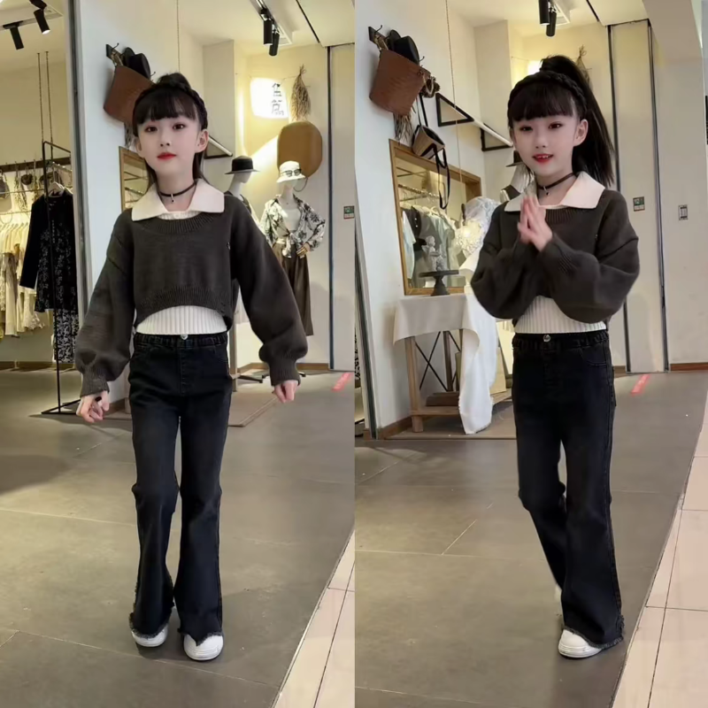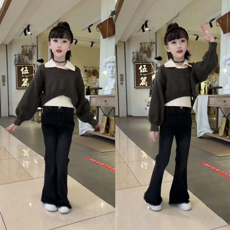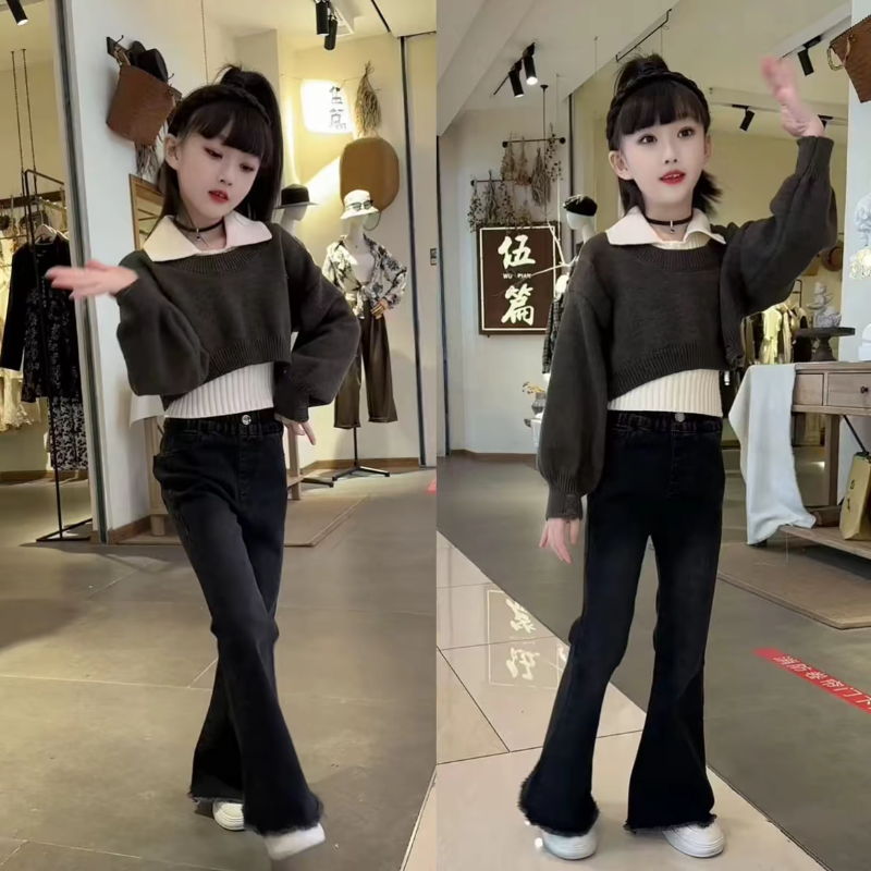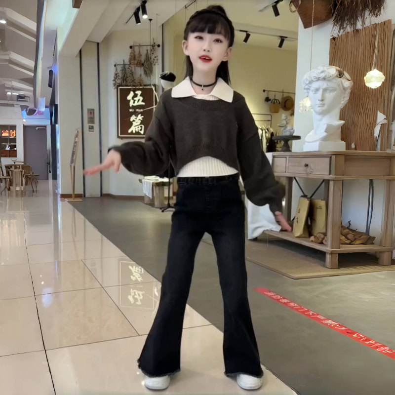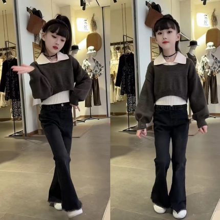 韩版时髦衬衫领毛衣两件套女童春秋新款洋气显瘦牛仔喇叭裤套装潮