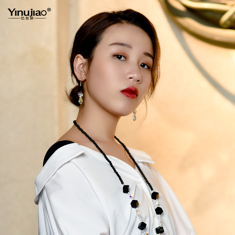 忆奴娇连翘S925纯银饰品水晶耳环中长款水滴耳坠方块黑玛瑙耳饰女