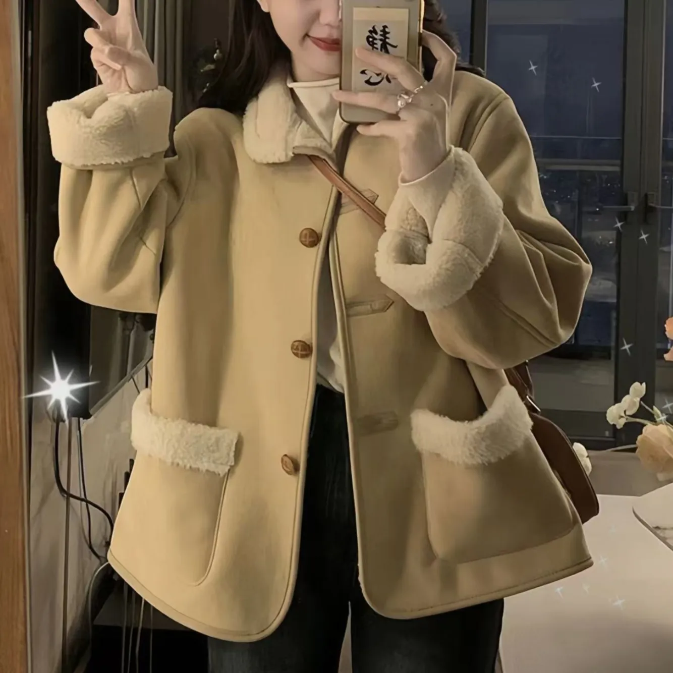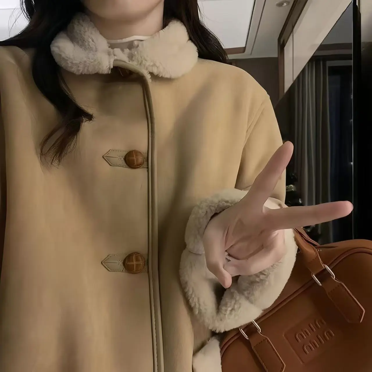冬季羊羔毛外套女复古设计感拼接短款皮毛一体加厚保暖小个子棉服
