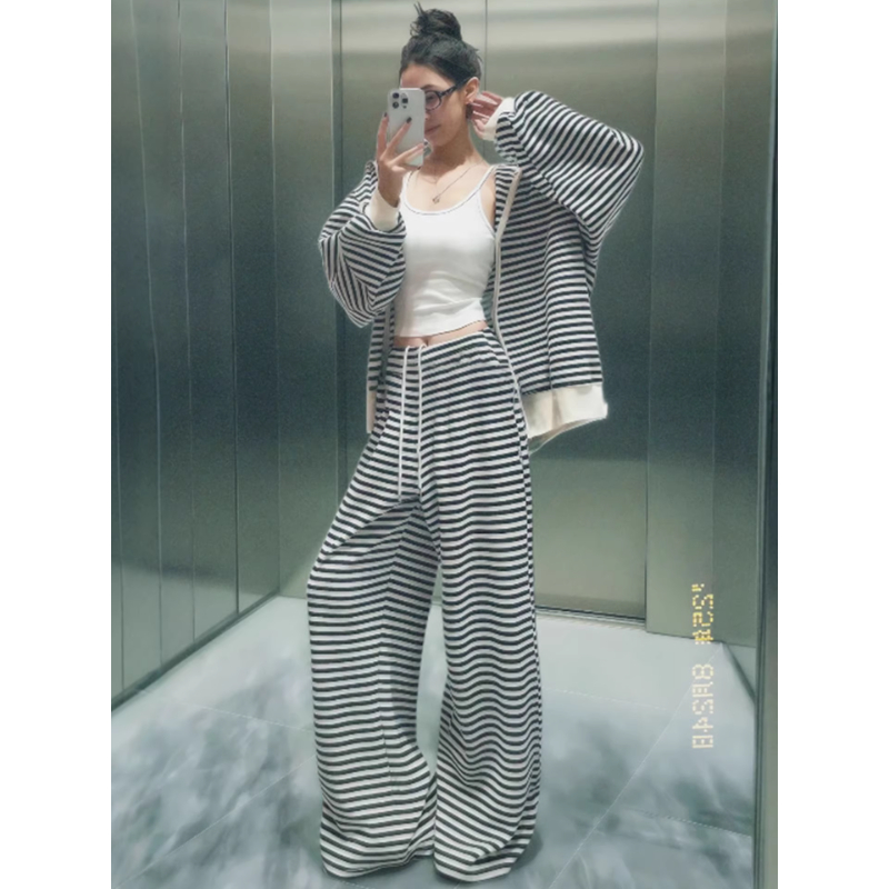巨好看的早秋一整套轻熟风条纹连帽卫衣阔腿裤套装女2025新款秋季