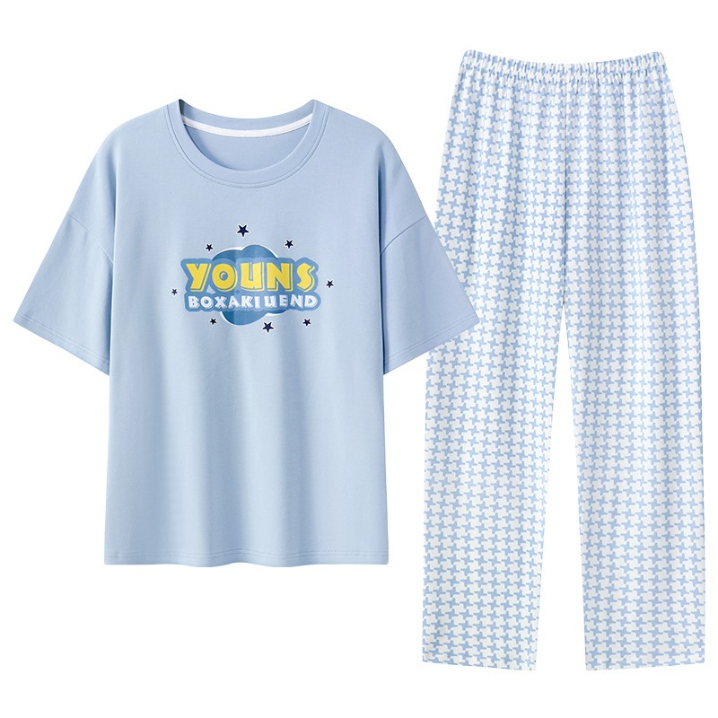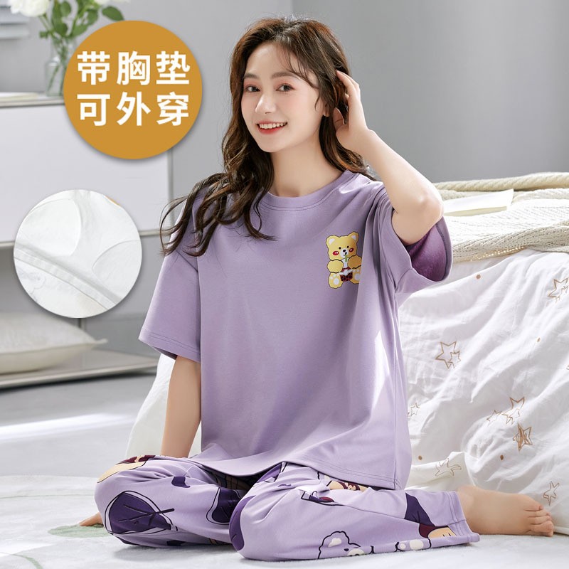 浪莎纯棉带胸垫一体睡衣女夏季短袖长裤韩式可外穿家居服两件套装