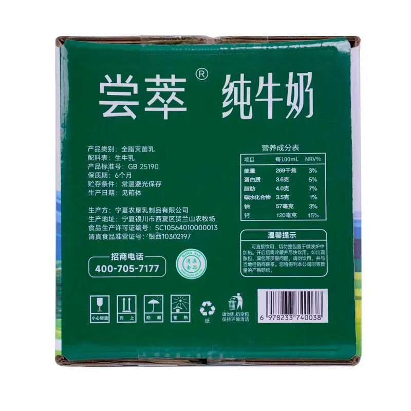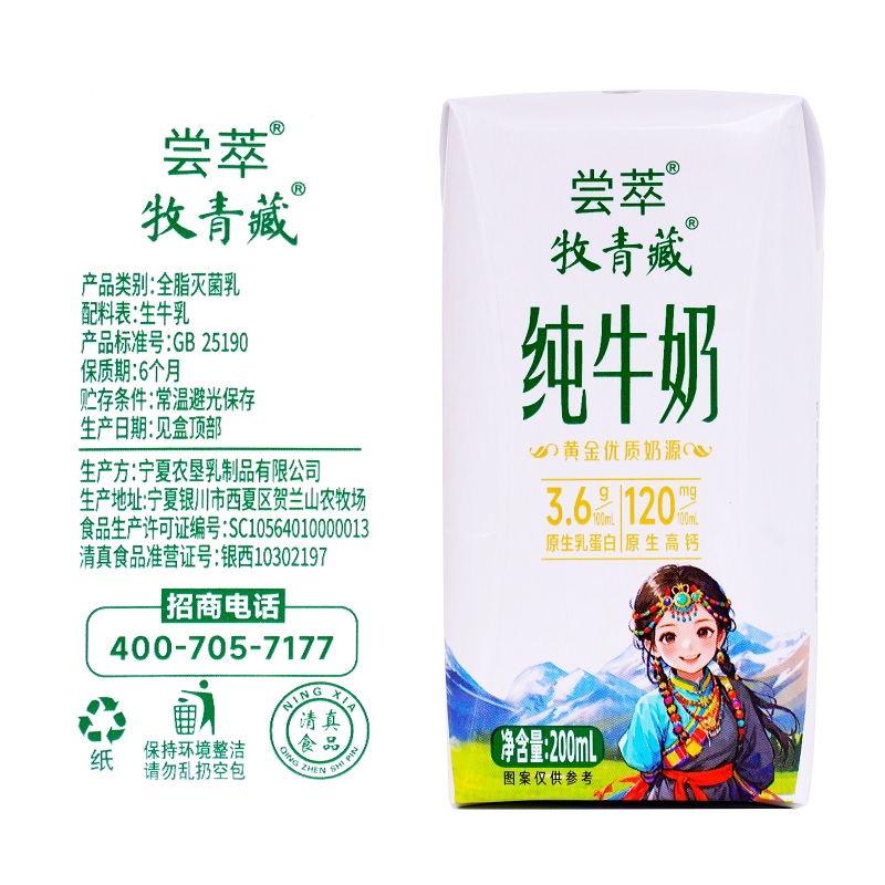 【牧青藏】3.6g乳蛋白 整箱200ml 宁夏农垦儿童优质纯牛奶早餐奶