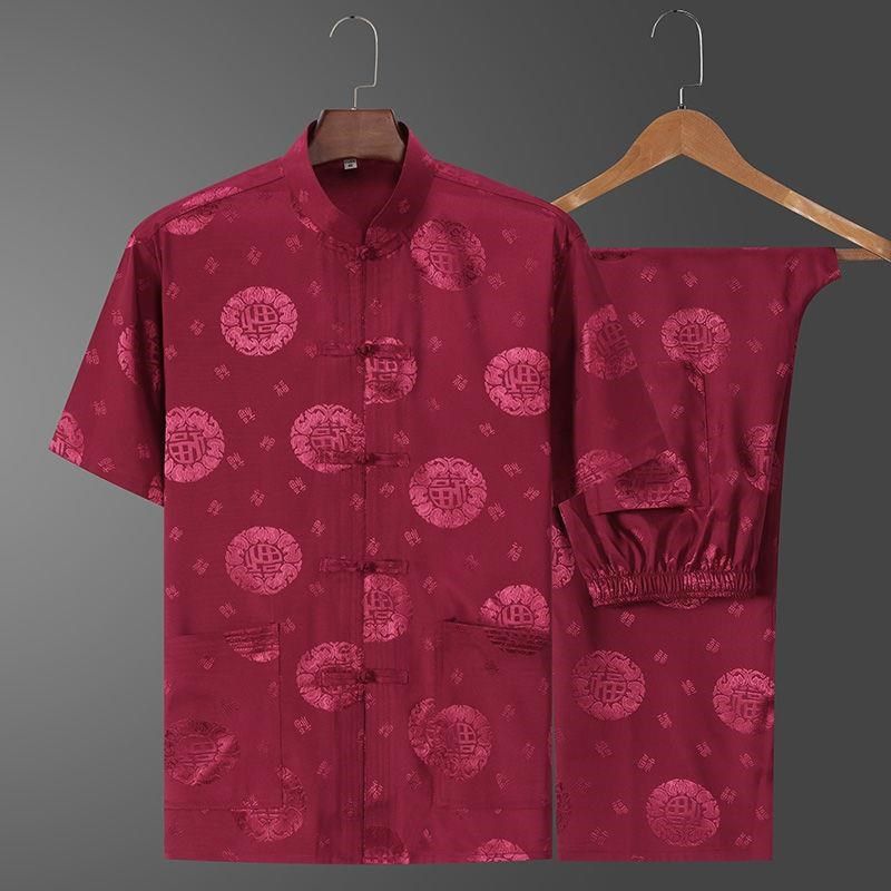 夏季唐装男短袖上衣中老年人中式丝质民族服装盘扣大码衬衫爷爷装