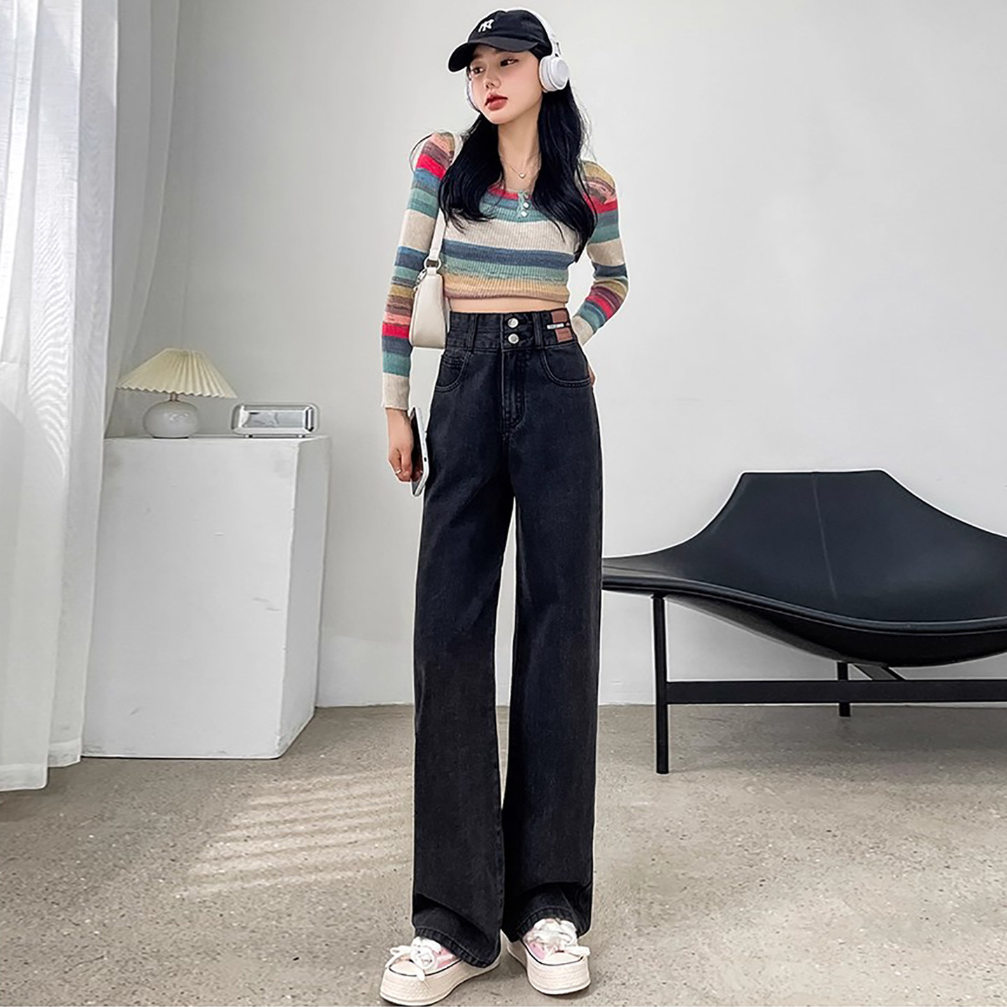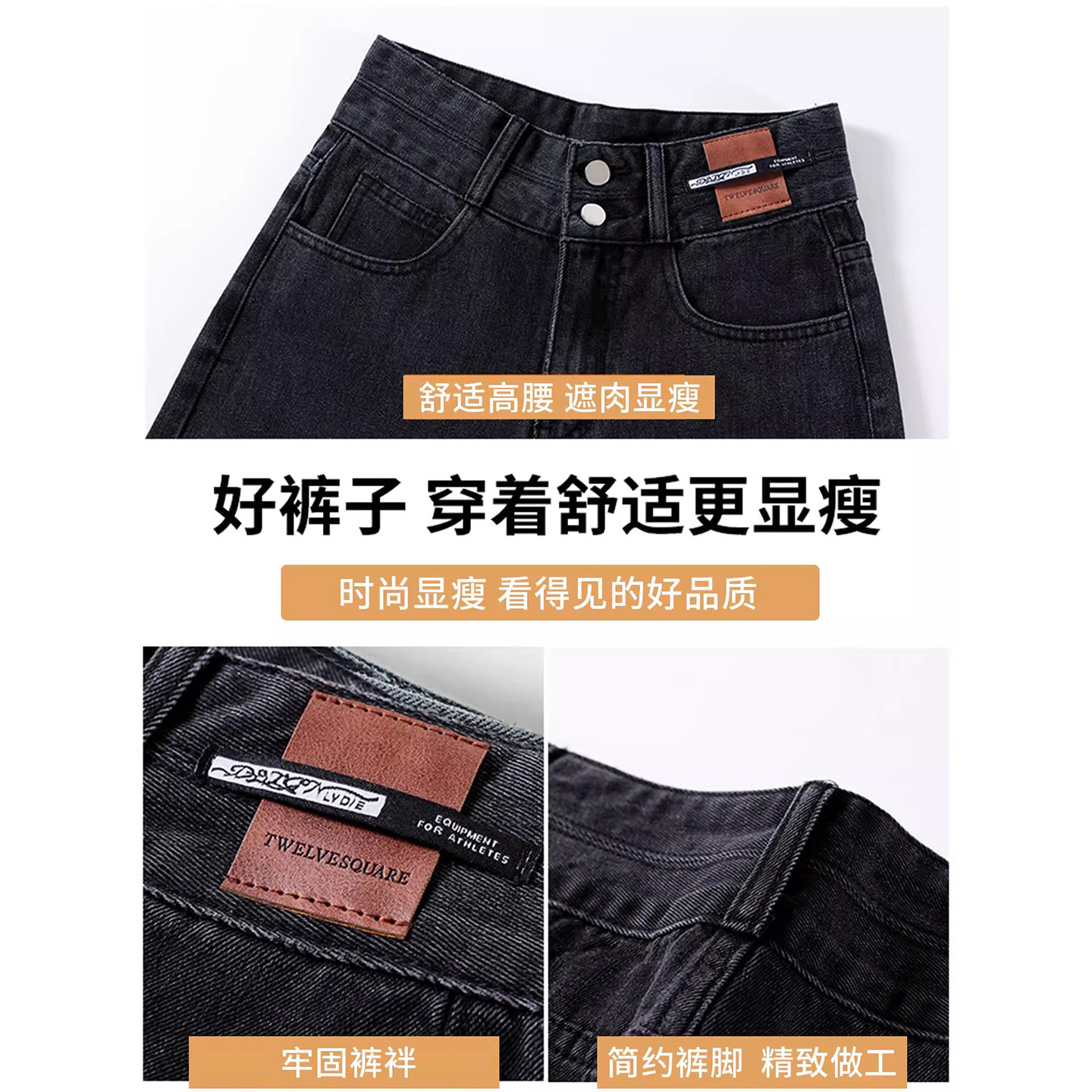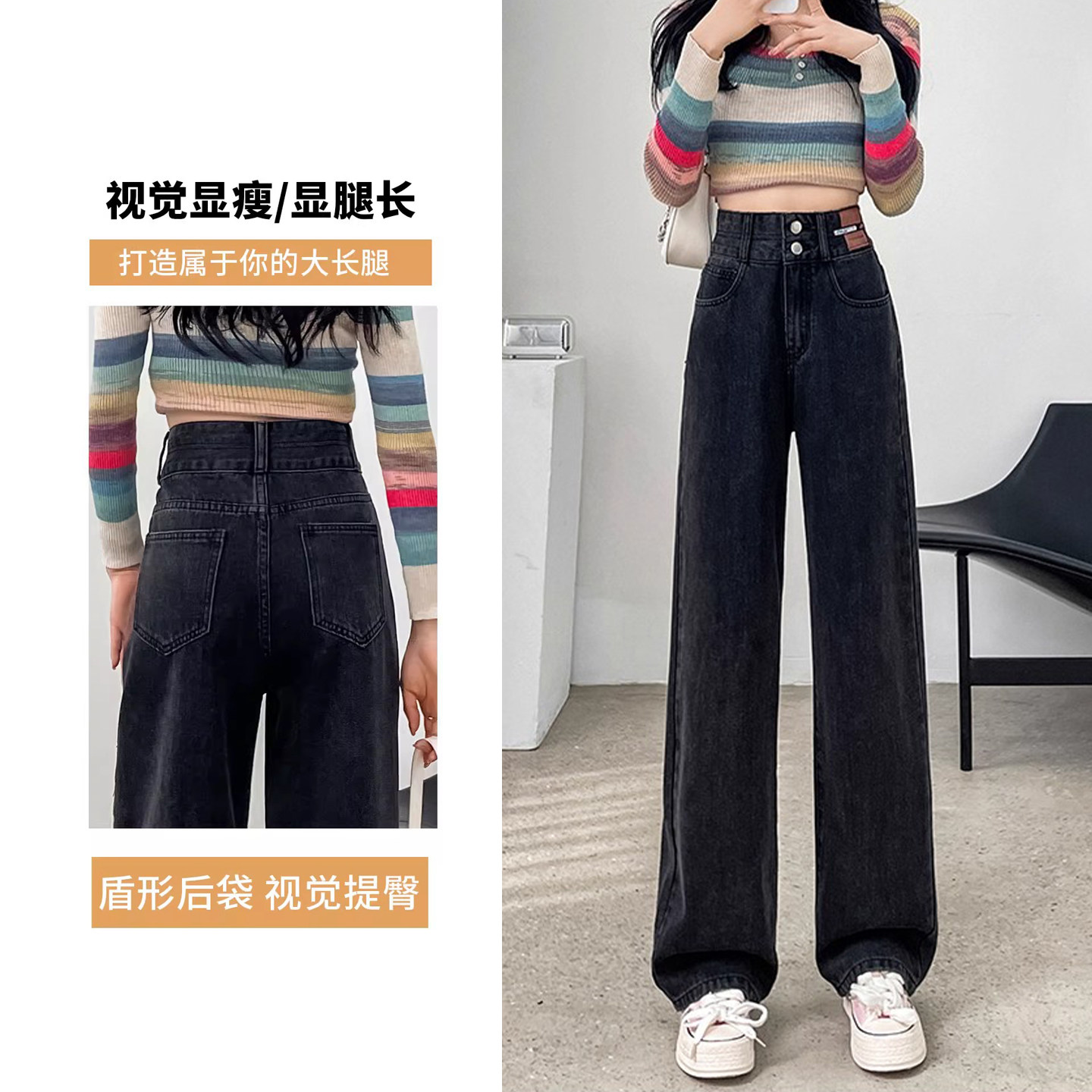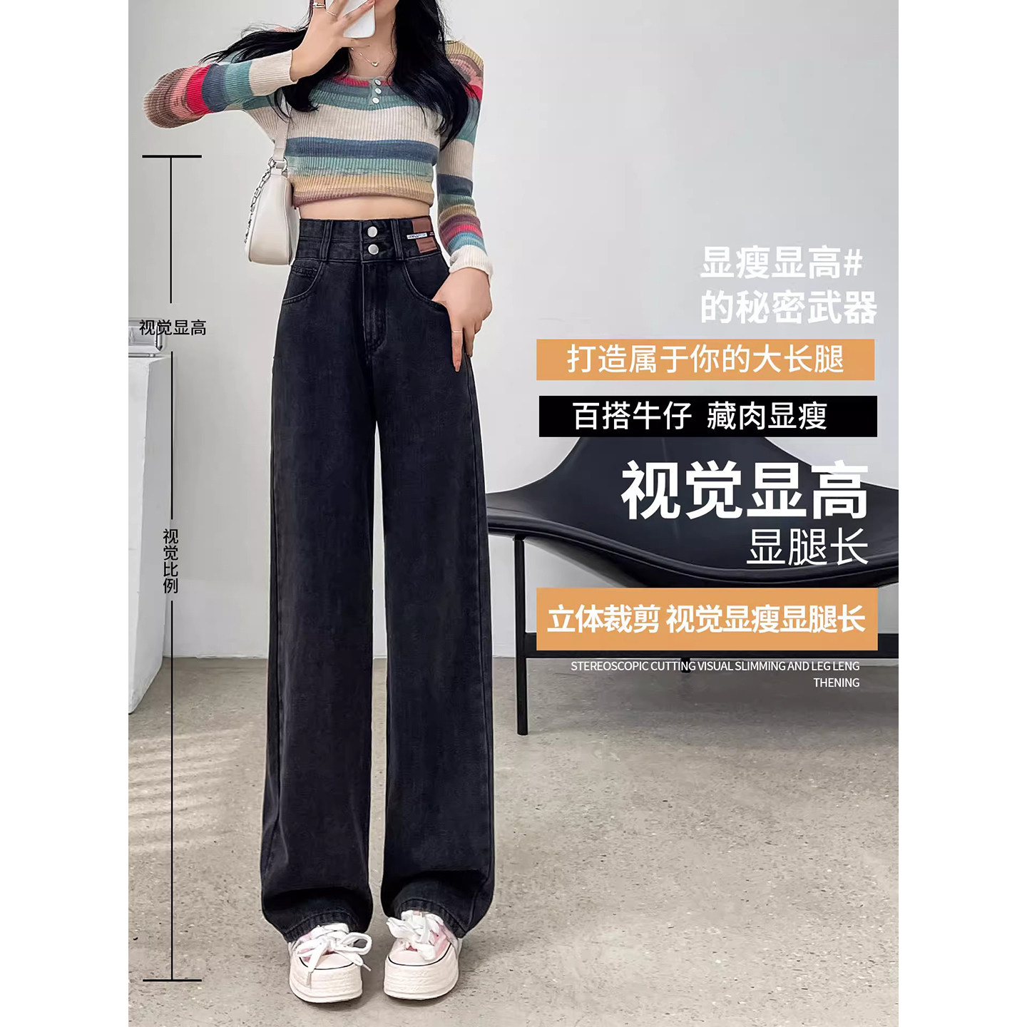 NG真维斯黑灰色加绒牛仔裤女秋冬季复古双扣高腰直筒窄版阔腿长裤