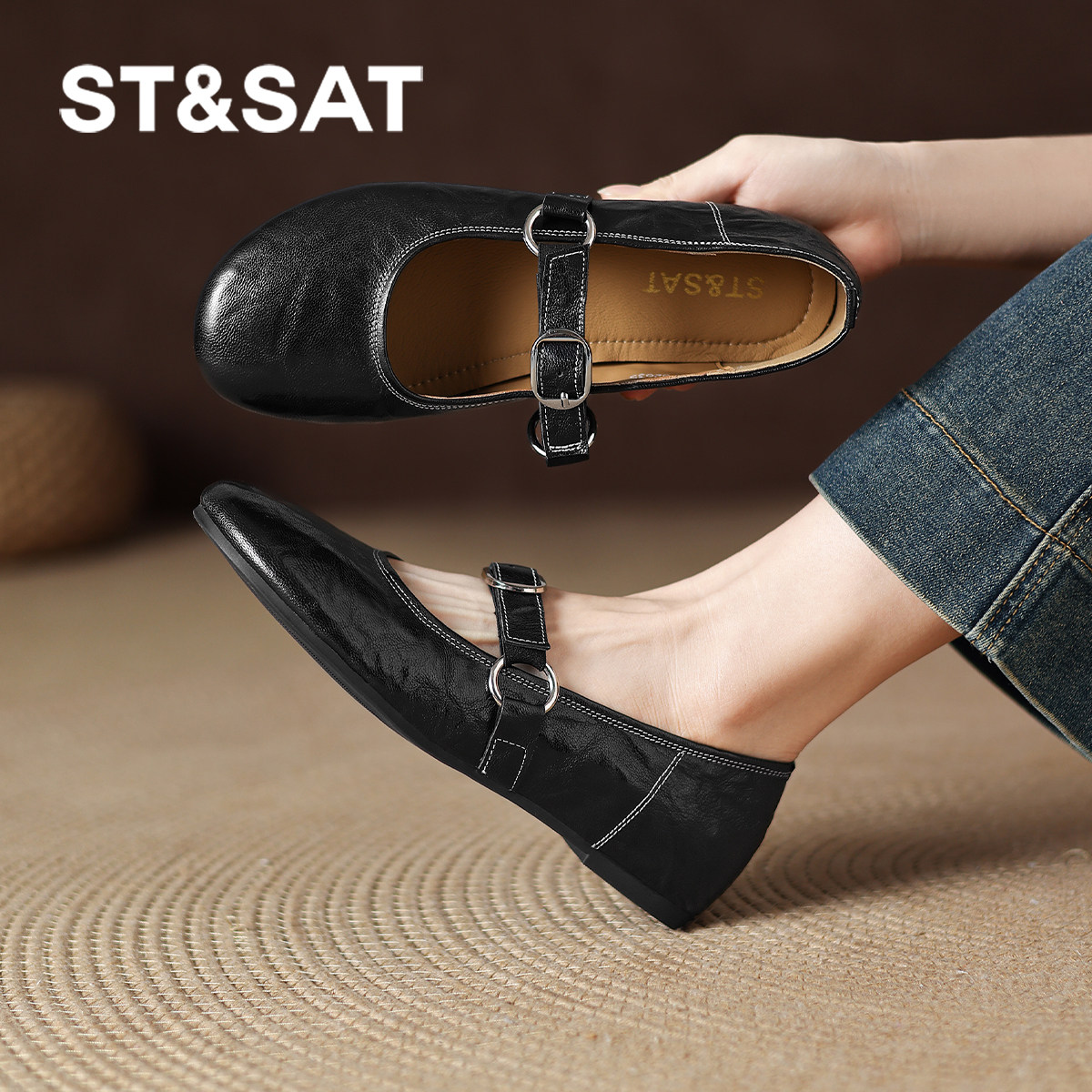 星期六法式复古圆头软底玛丽珍鞋