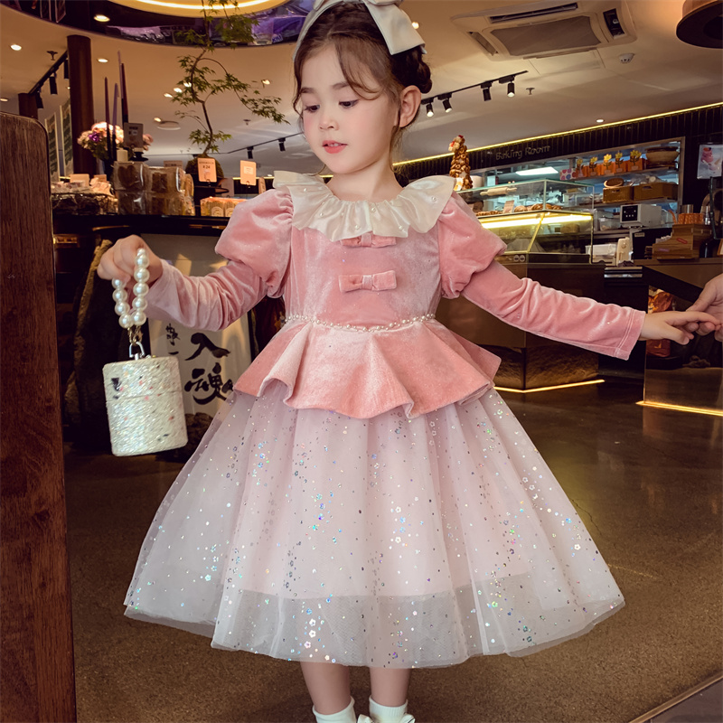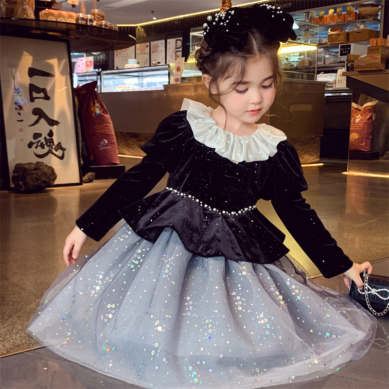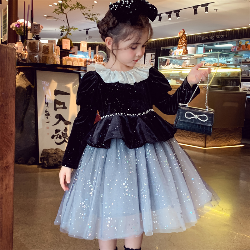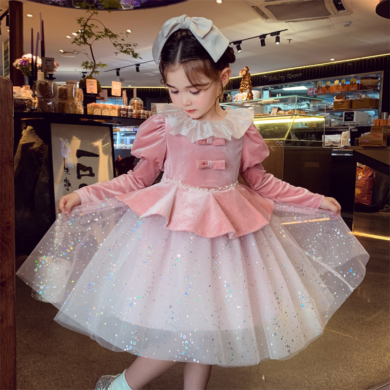 米米哈罗女童公主裙冬2025新款儿童蓬蓬网纱连衣裙女孩法式丝绒裙