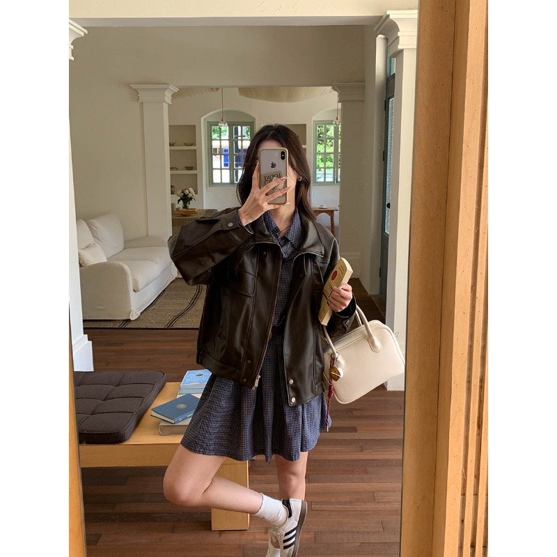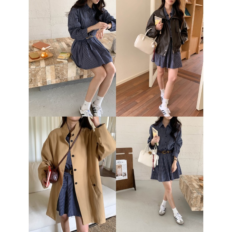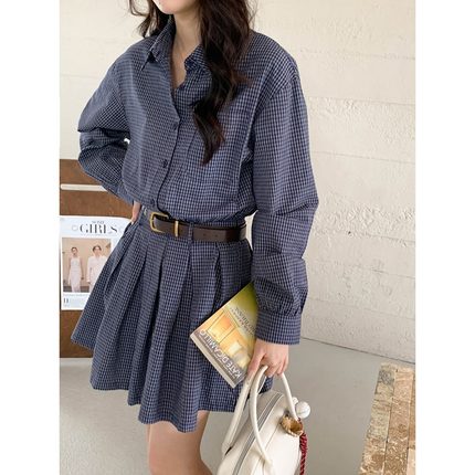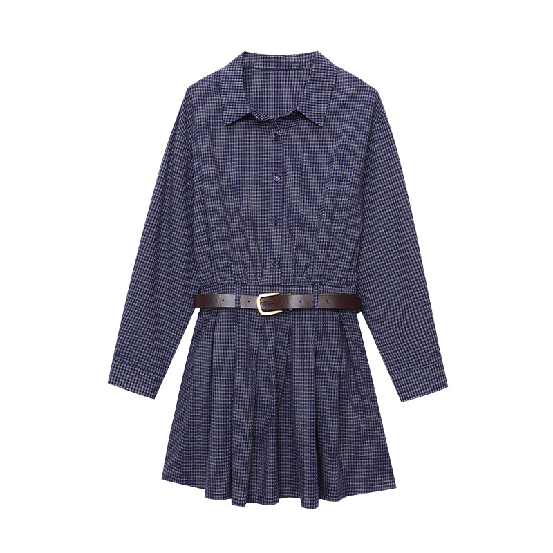 好看的含腰带中古蓝色格子衬衫连衣裙女2025秋新款法式格纹显瘦