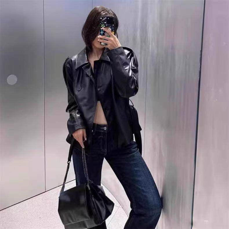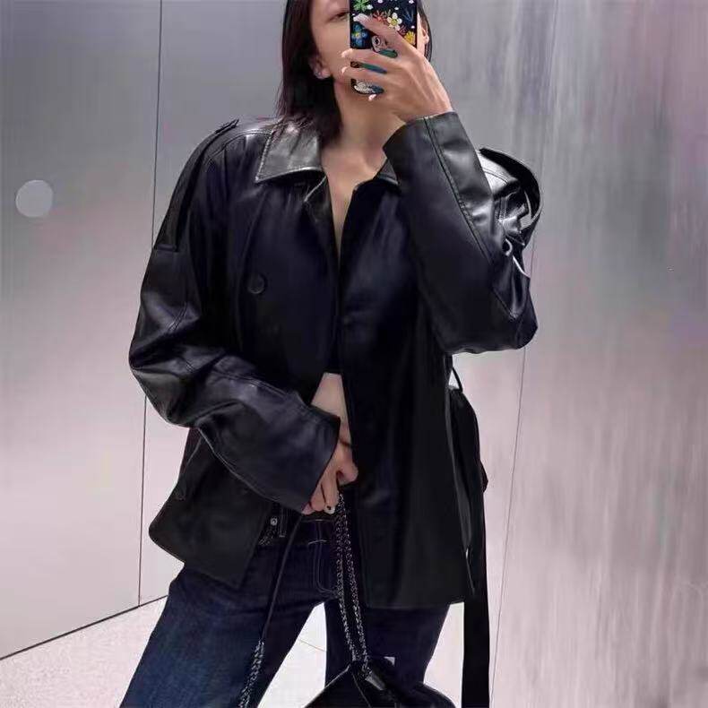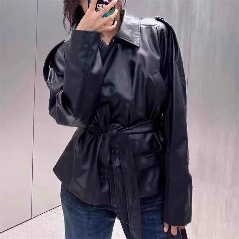 秋季新品女装短款系腰带仿皮长袖短风衣皮衣外套夹克 4749743 800