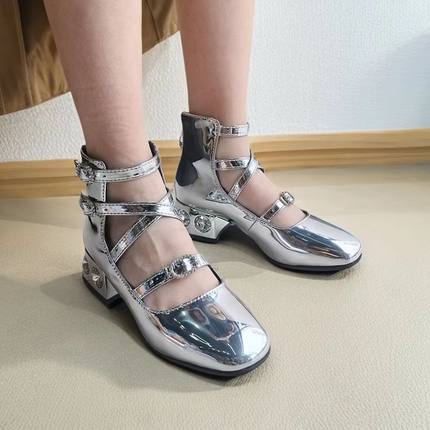 春夏金色银色粗跟宝石高帮玛丽珍单鞋小码模特走秀比赛舞台小黑鞋