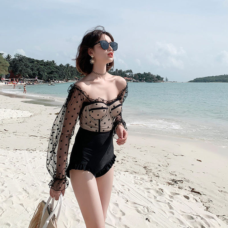 新款泳衣女连体保守长袖性感遮肚显瘦温泉钢托小胸聚拢游泳装海边