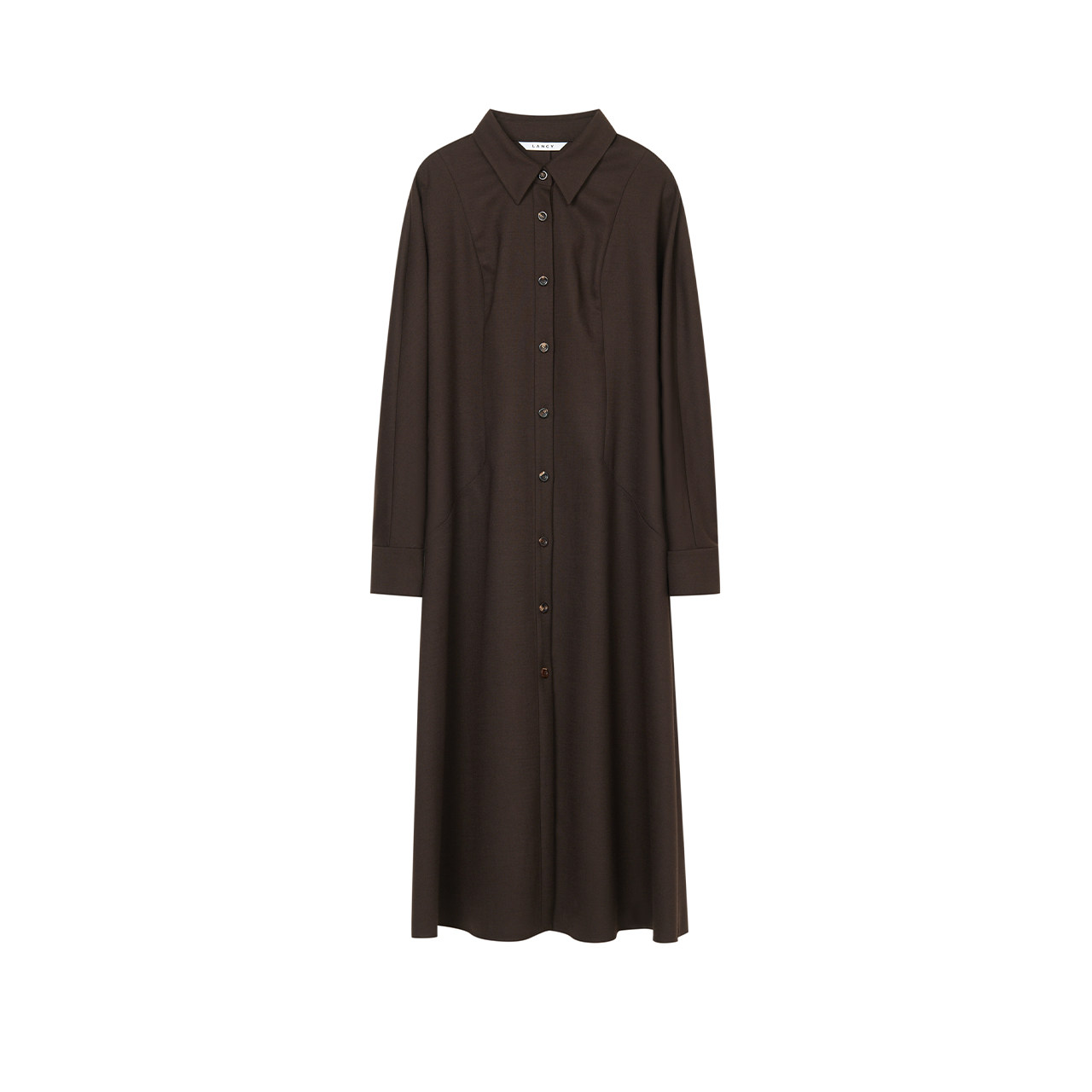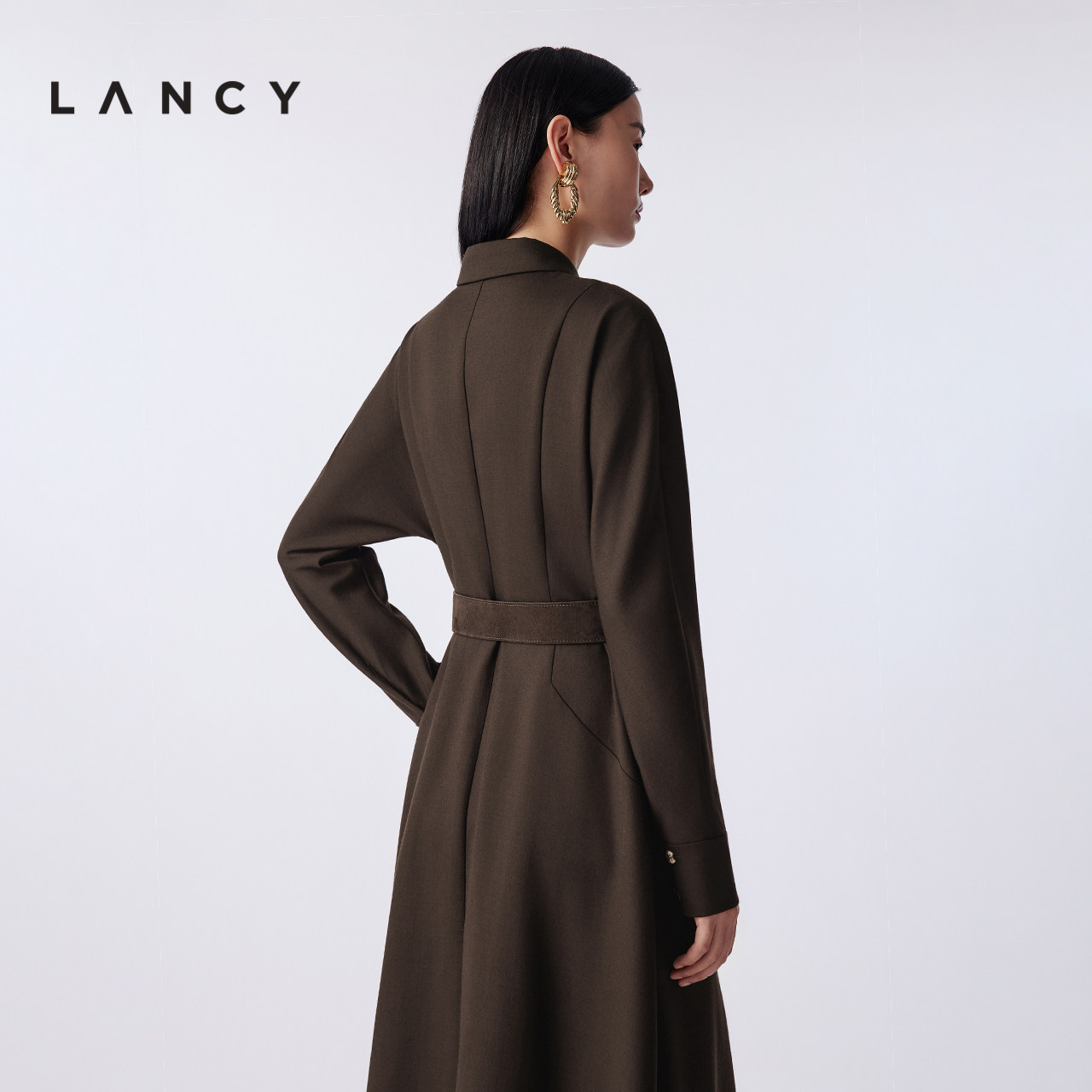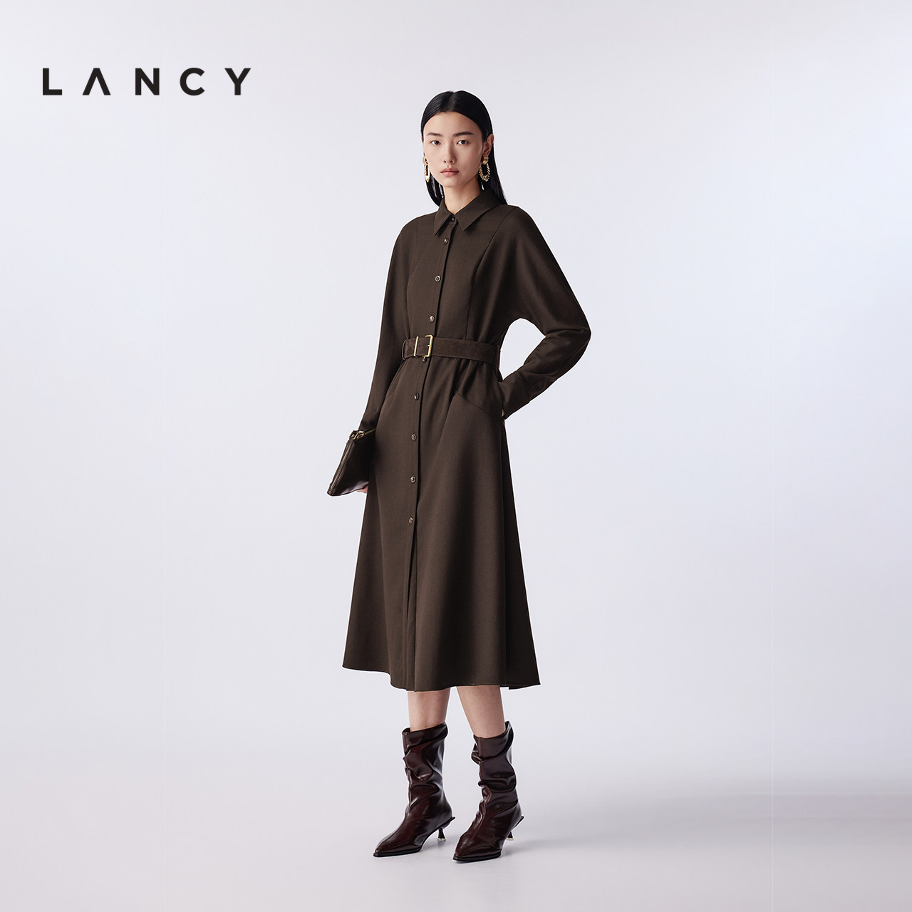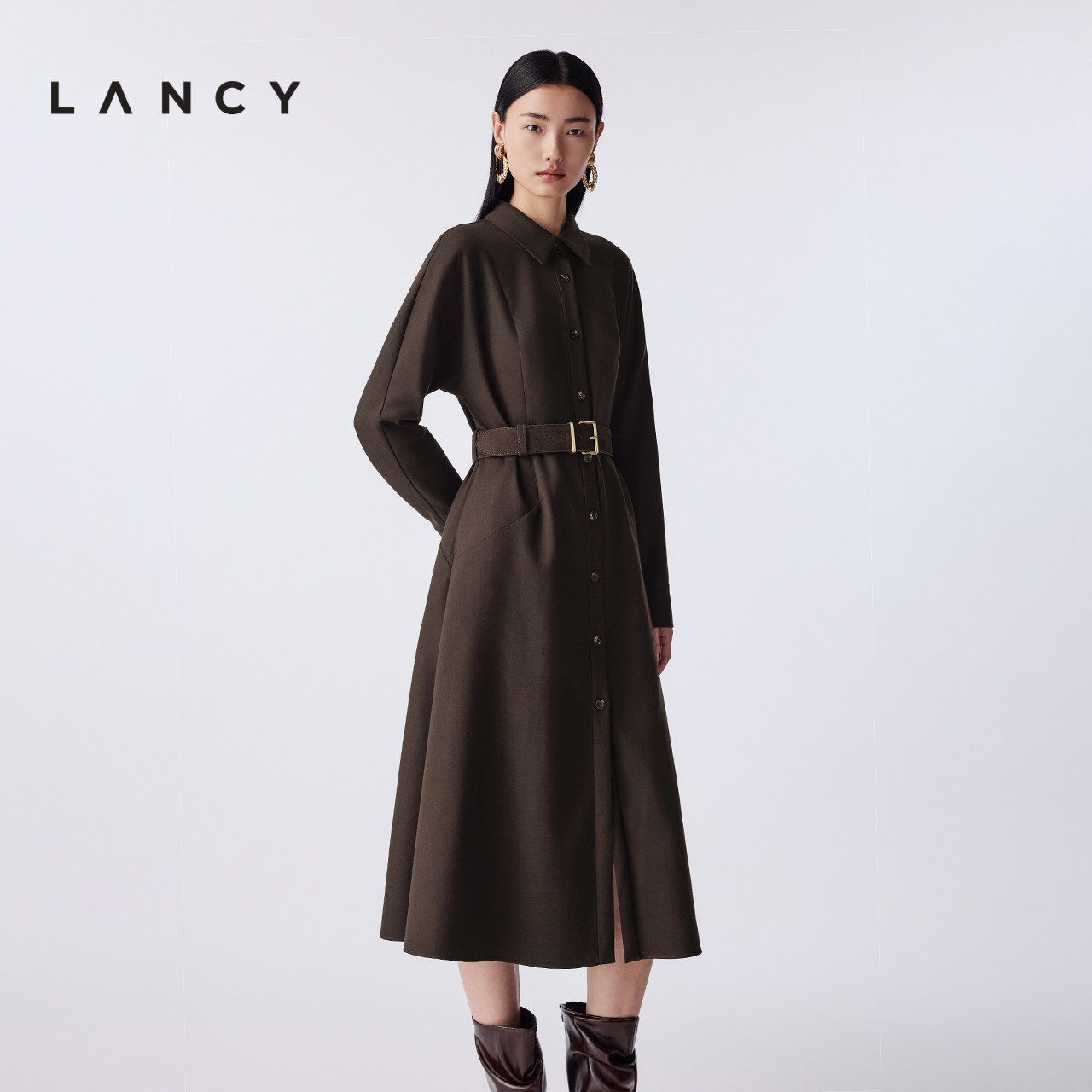 LANCY/朗姿2025冬季新款衬衫收腰长款A字羊毛秋冬通勤高端连衣裙