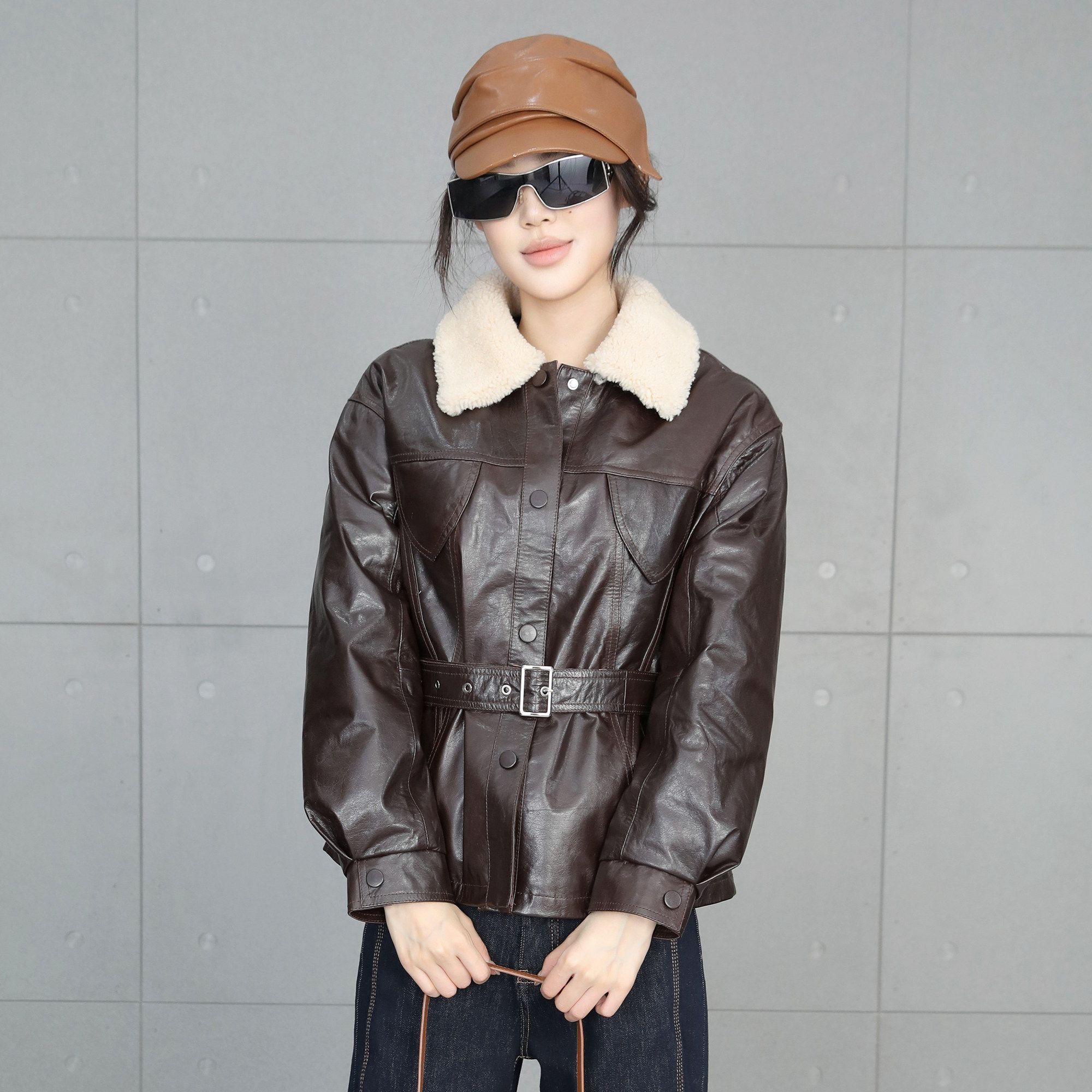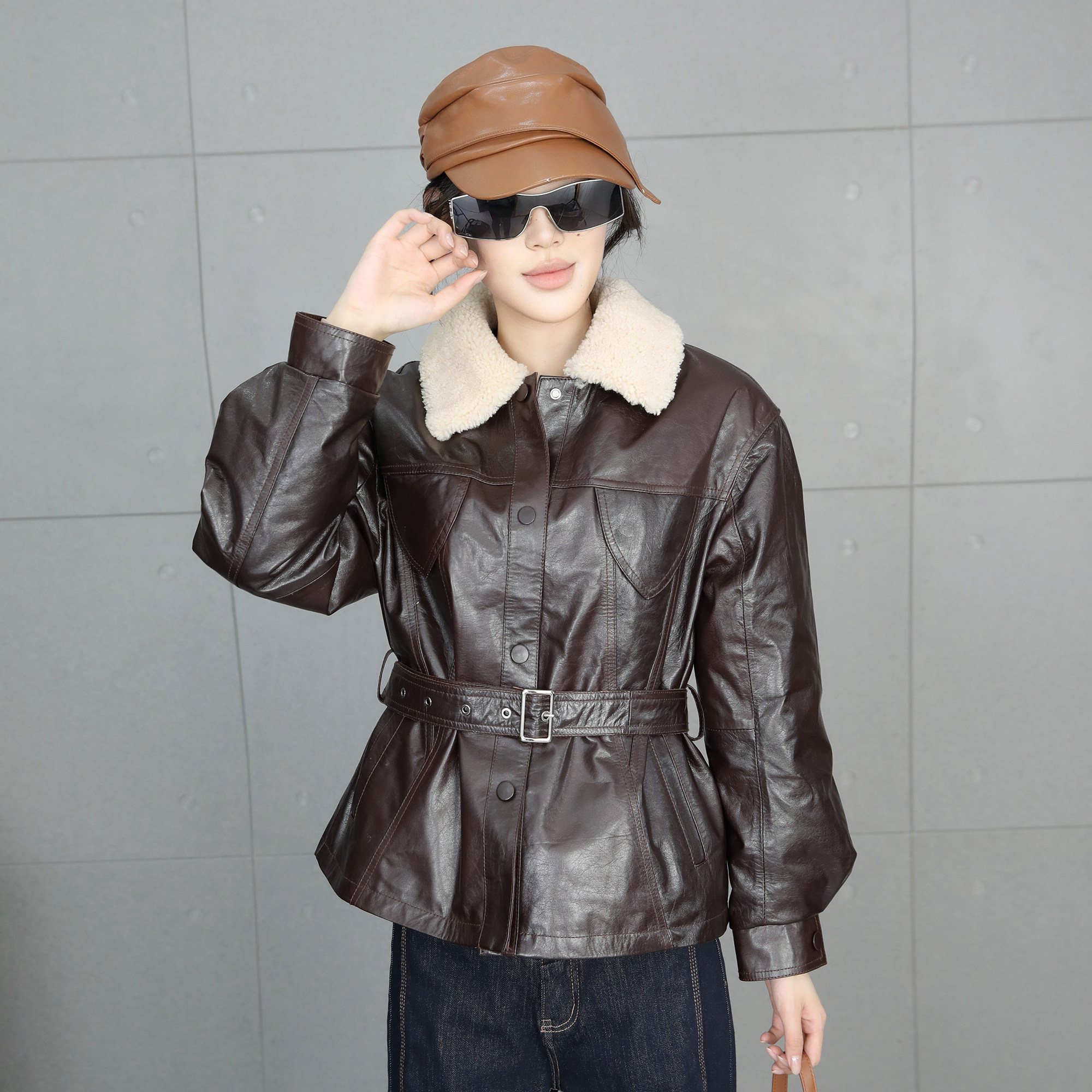 鹅绒皮衣女短款2025冬新款油蜡皮咖色羽绒服真皮羊羔毛领修身外套