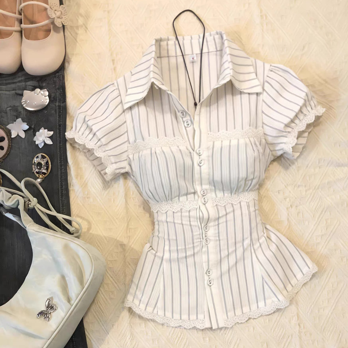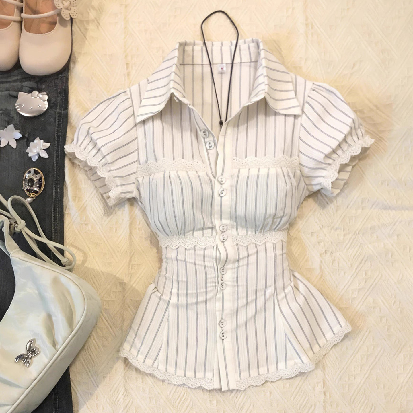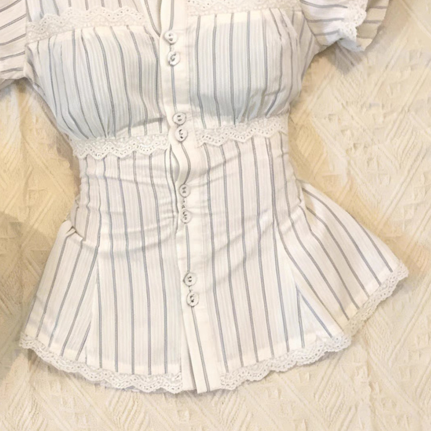 纯欲甜妹风条纹泡泡袖衬衫女古着蕾丝拼接收腰显瘦设计感Y2K上衣