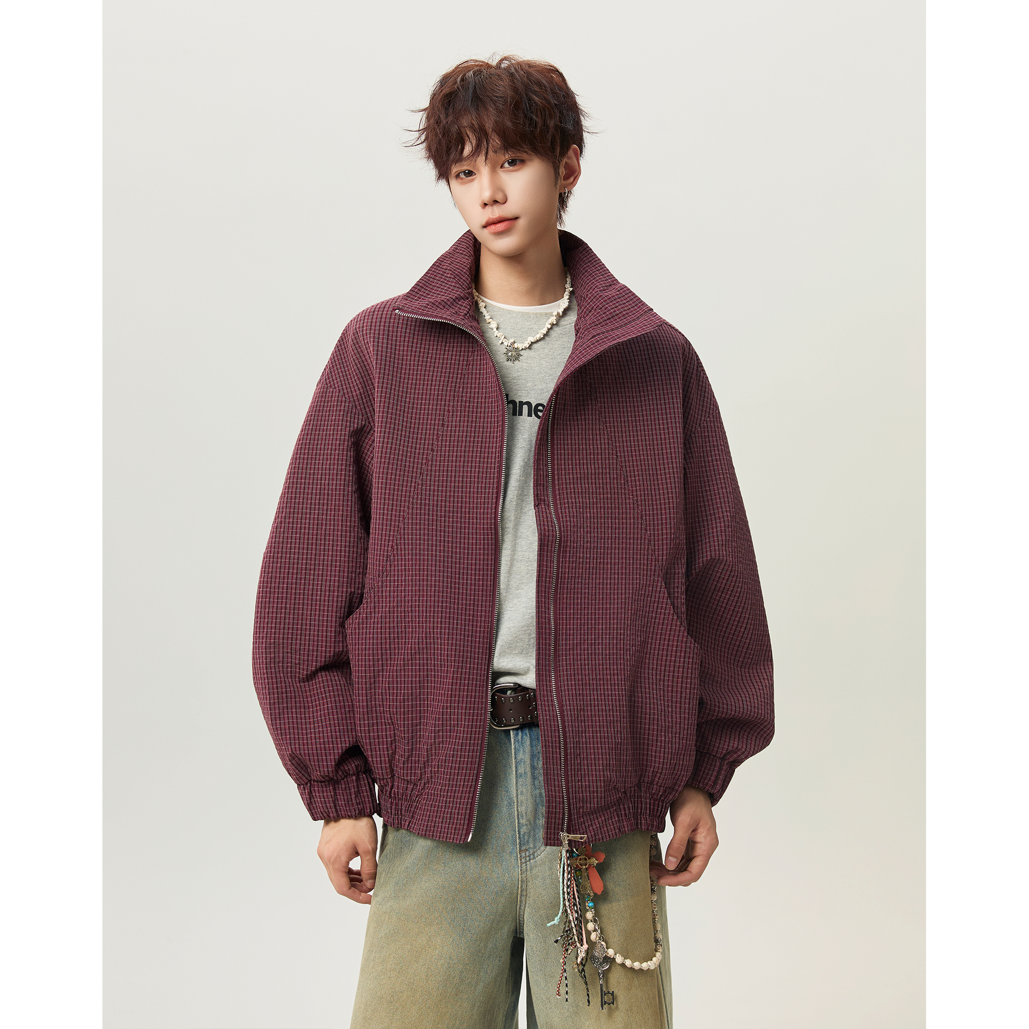 潮牌棕红色格纹立领拉链夹克男秋冬美式痞帅宽松休闲百搭开衫外套