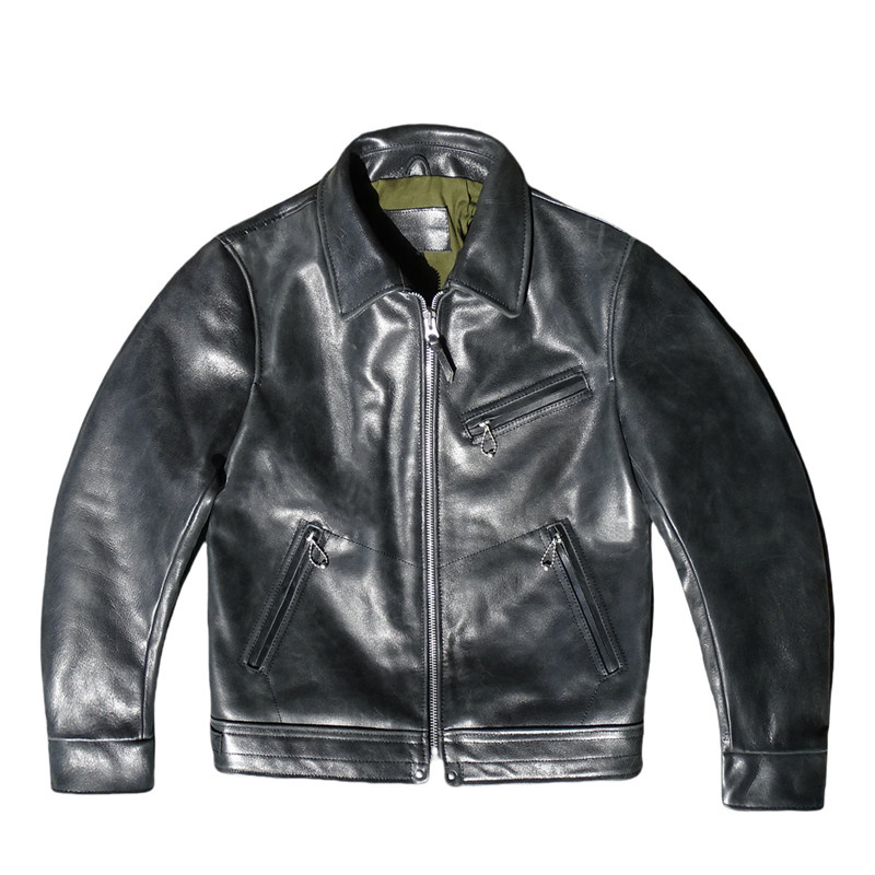 穆赫兰道款!铁灰黑色1.5mm超厚硬挺植鞣进口牛皮真皮皮衣男翻领