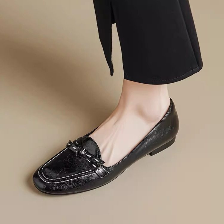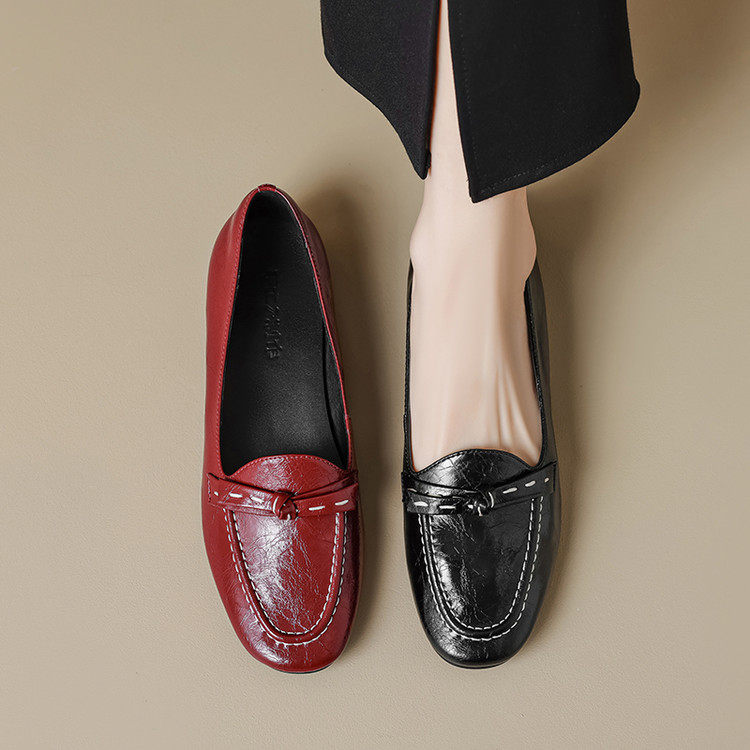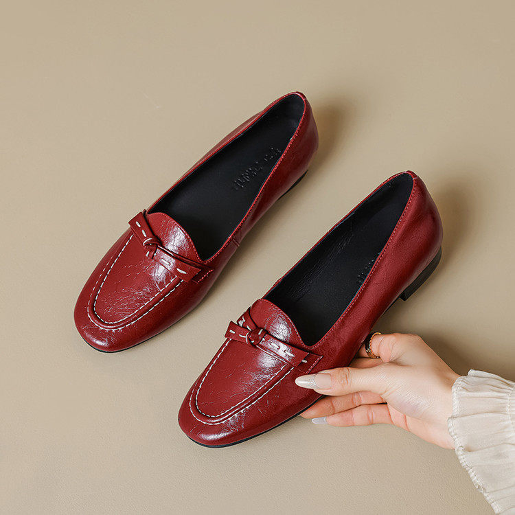 真皮平底单鞋女春夏新款复古小皮鞋时尚百搭蝴蝶结圆头乐福鞋红色