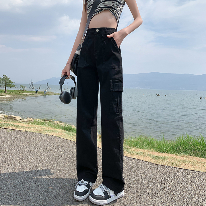卡其色高腰美式窄版直筒工装裤女春季新款复古休闲阔腿拖地牛仔裤