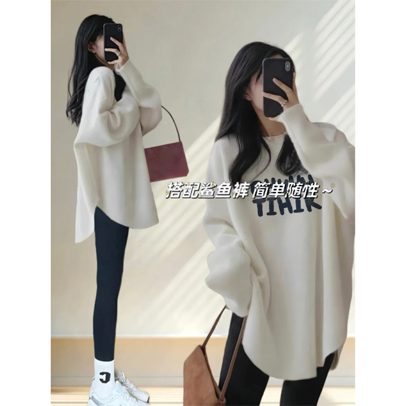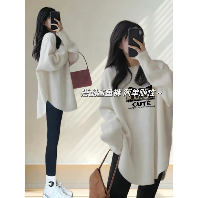 白色宽松纯棉长袖t恤女秋冬打底衫女中长款德绒搭配鲨鱼裤的上衣