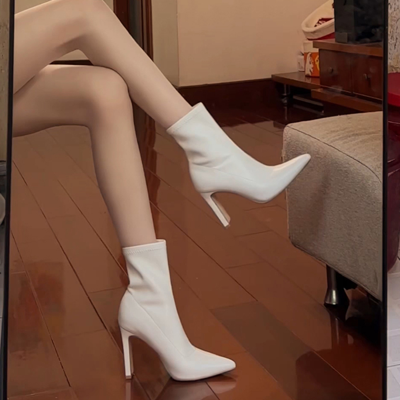 法式高跟米白色短靴女2025年秋冬季粗跟尖头皮靴新款瘦瘦靴单靴女