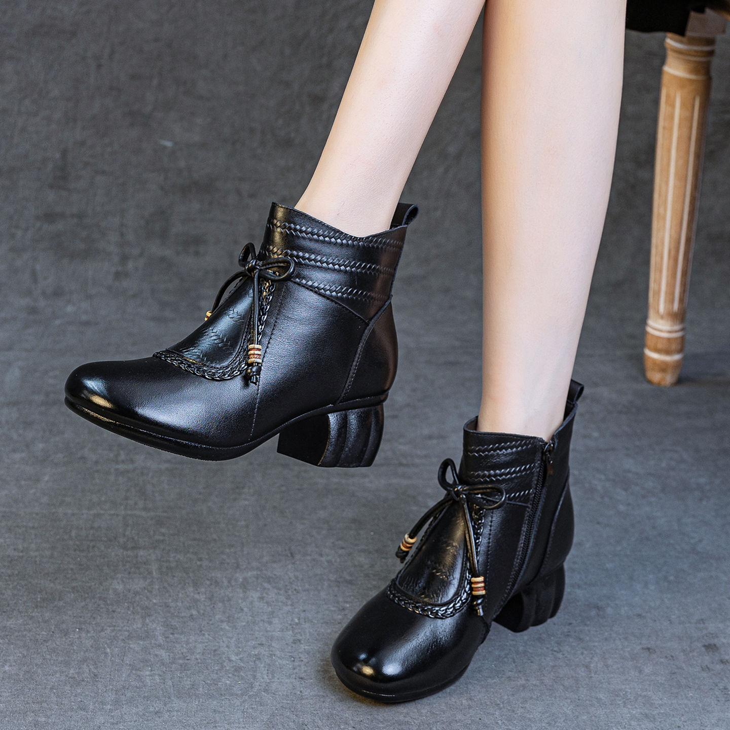 秋冬季新款真皮女靴加绒棉靴头层牛皮时尚复古中粗跟软底女短靴