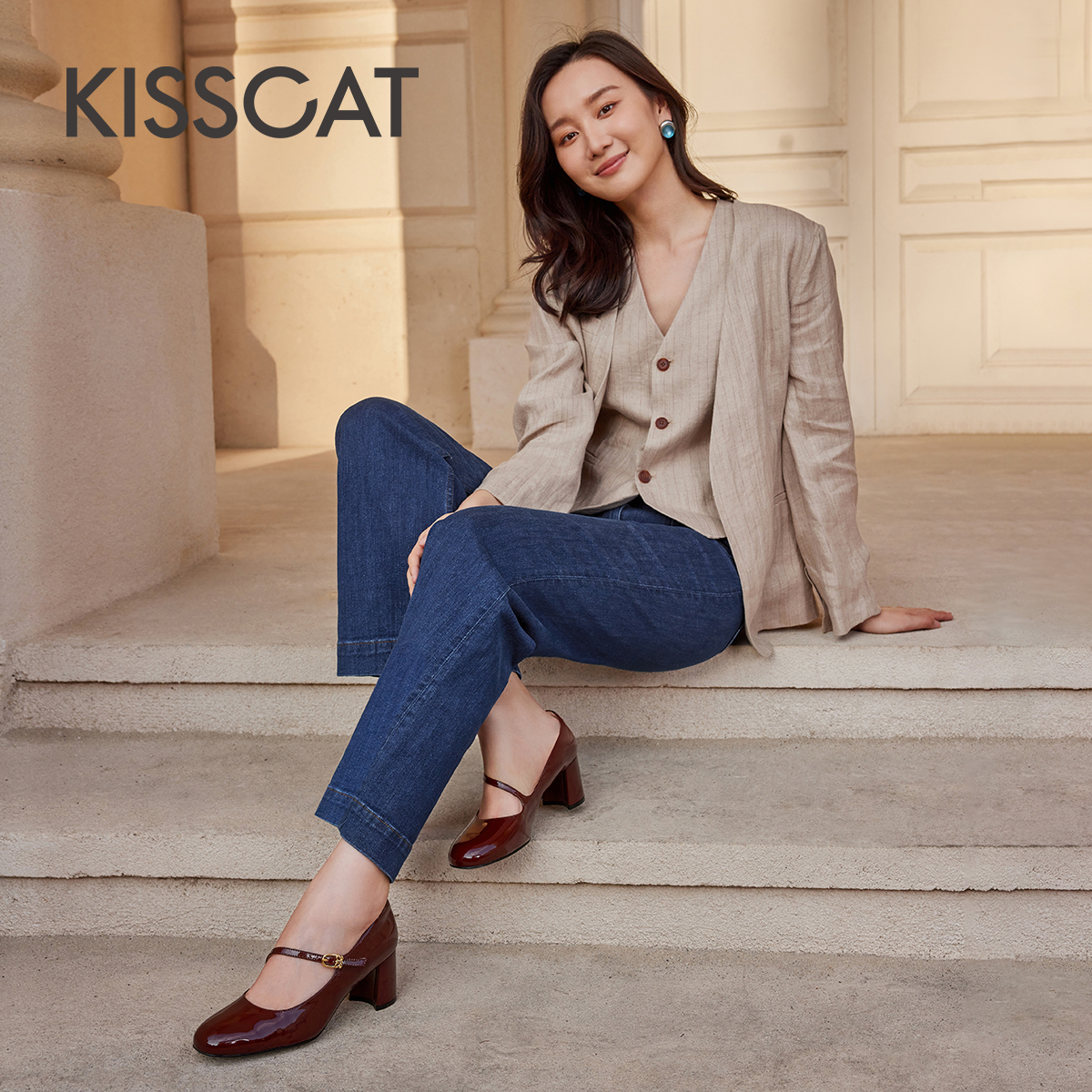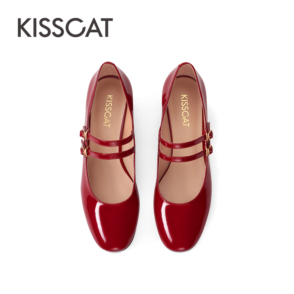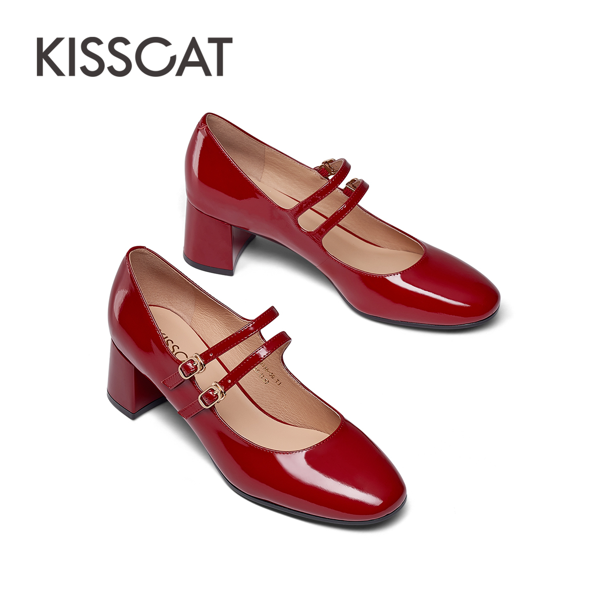 KISSCAT接吻猫秋季新款复古红色玛丽珍鞋舒适圆头漆皮粗跟单鞋女