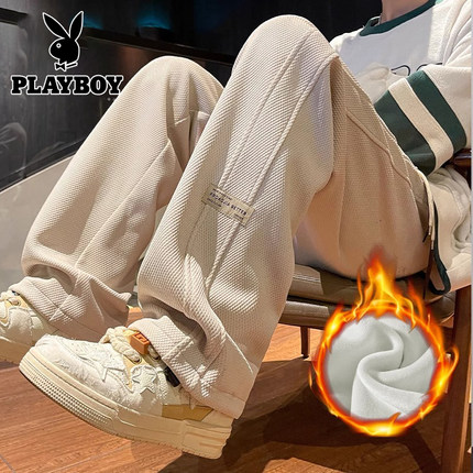 花花公子秋冬季新款卫裤男士运动宽松直筒加绒加厚阔腿休闲长裤子