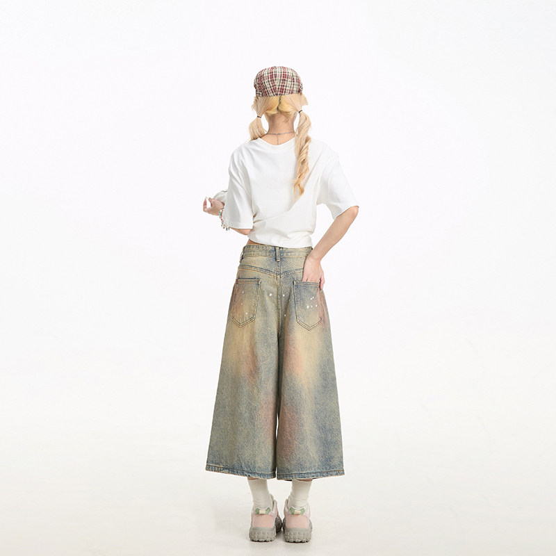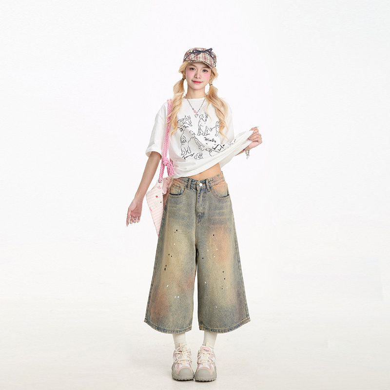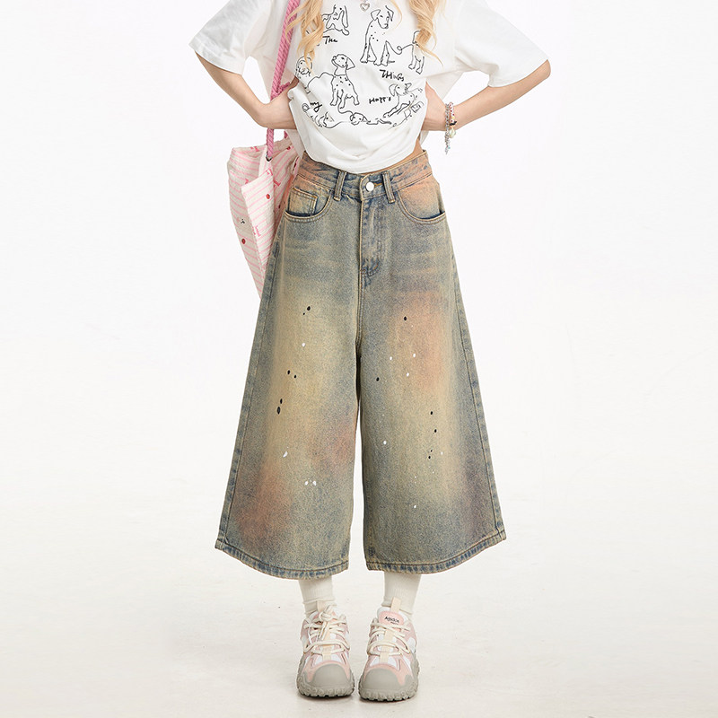NERESUM牛仔短裤女夏季新款美式做旧脏染裤子宽松直筒阔腿七分裤
