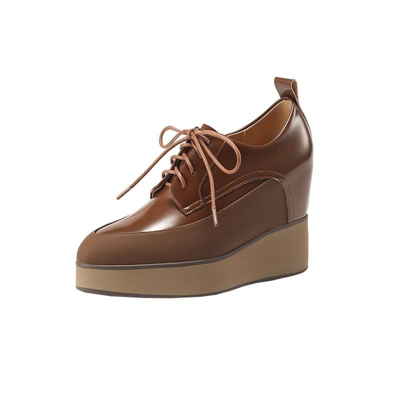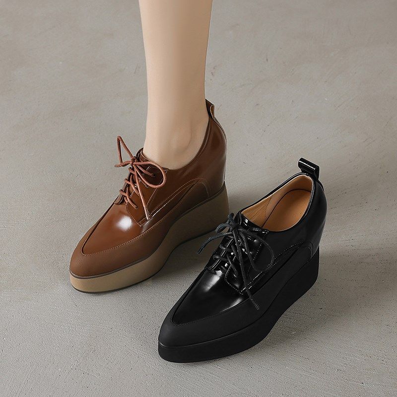 尖头坡跟内增高单鞋女款百搭真皮系带厚底松糕鞋小个子高跟小皮鞋