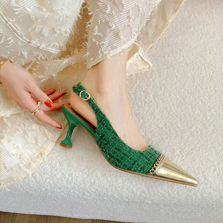 小香风糖果色高跟鞋2023新款夏季小香呢后空凉鞋女尖头金属链