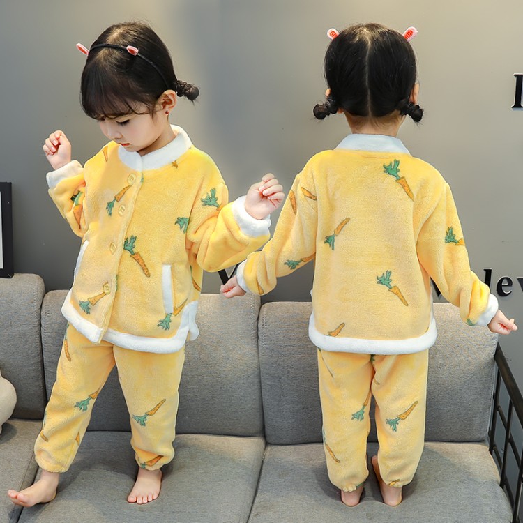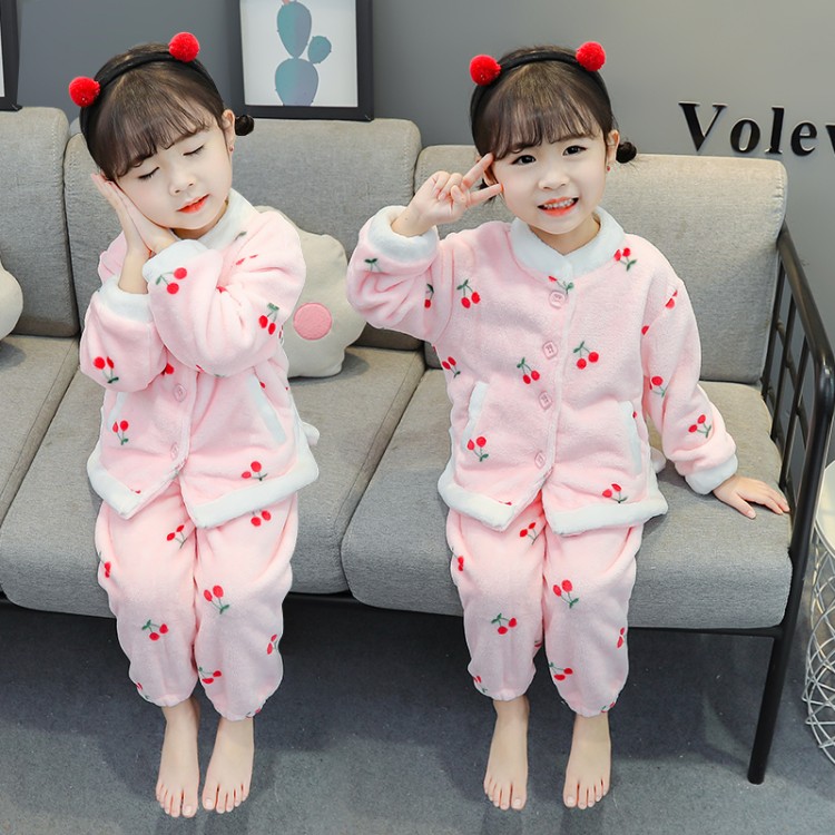 女宝宝新款冬季法兰绒睡衣1-6岁3女童珊瑚绒加厚开衫家居服两件套