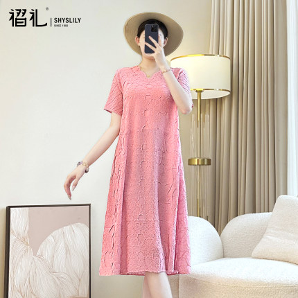 妈妈夏装高端气质粉色连衣裙2025新款三宅短袖裙子宽松大码遮肚子