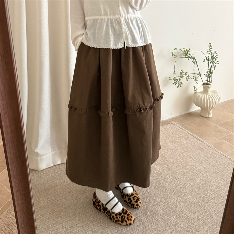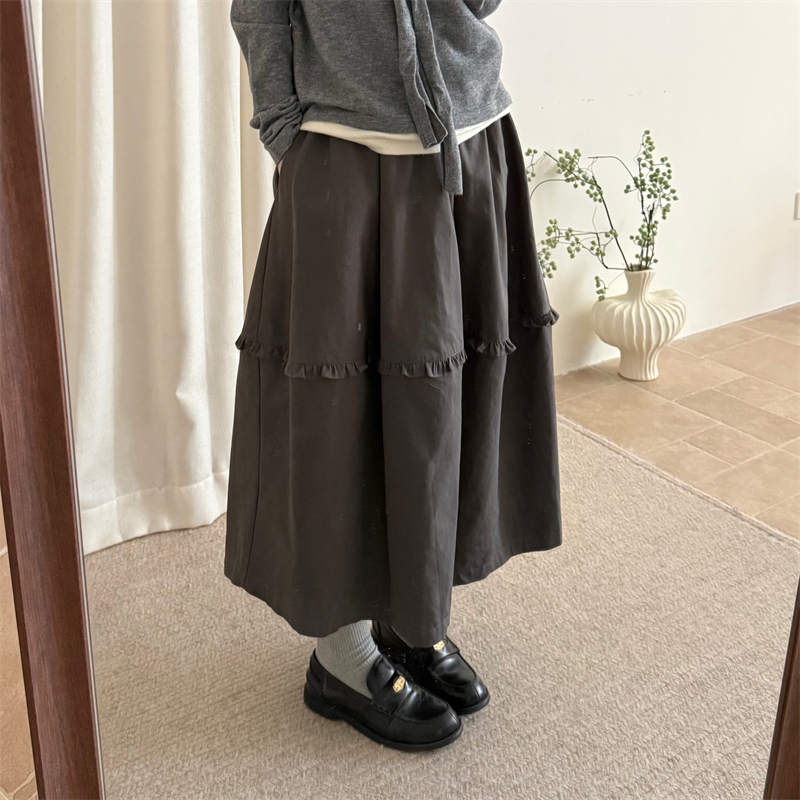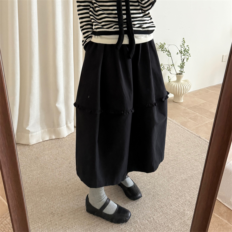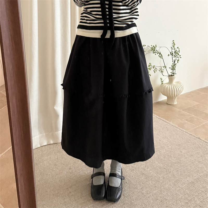 初吾家25早秋新款日系荷叶边拼接松紧腰半身裙女宽松显瘦中长裙子