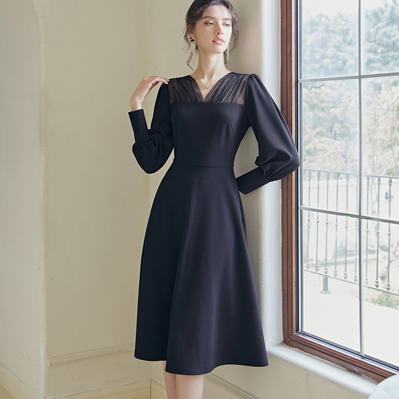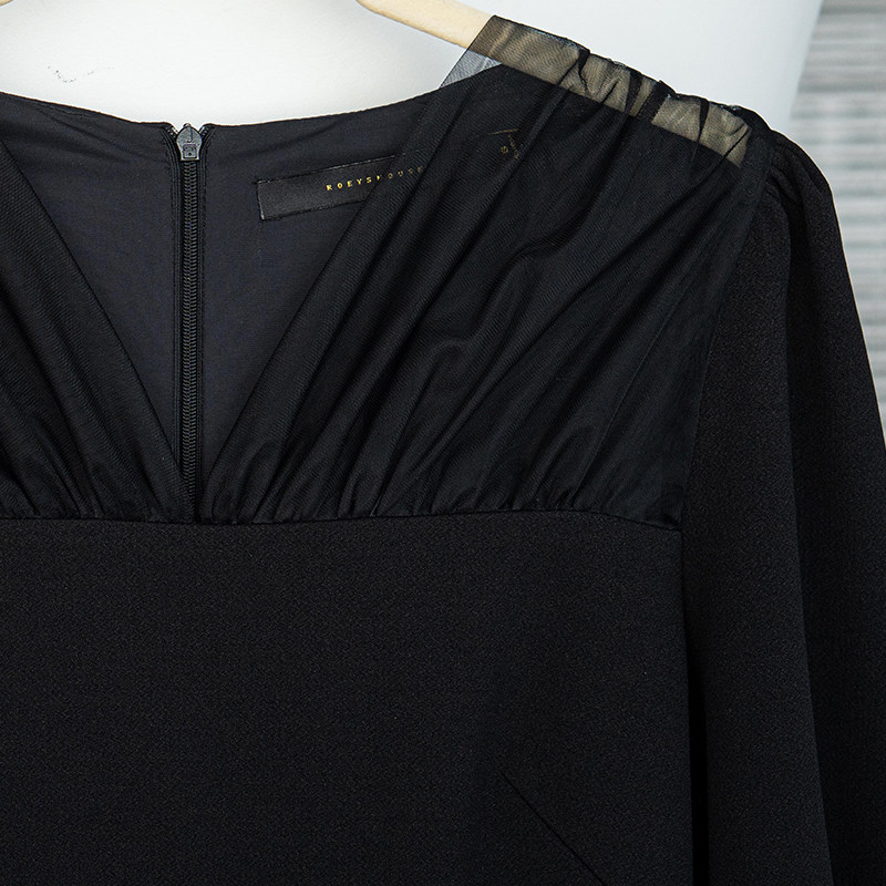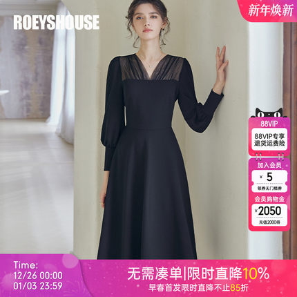 罗衣气质V领针织连衣裙2025秋装新款黑色拼接网纱大摆中长裙07655