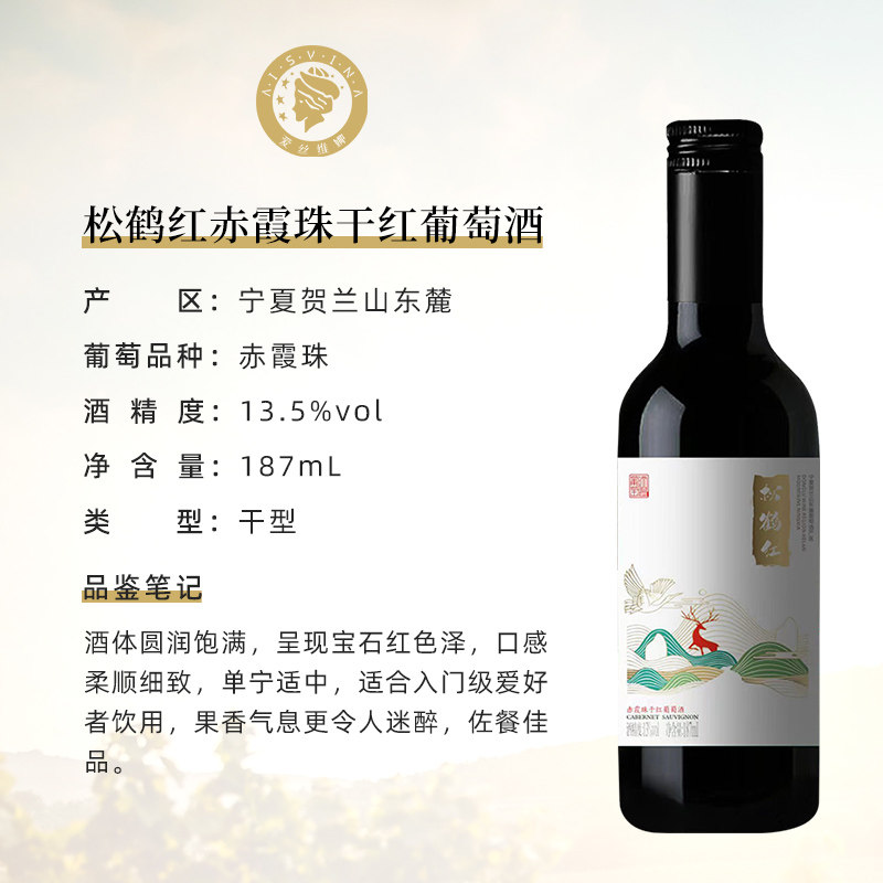 宁夏贺兰山东麓葡萄酒187ml整箱6支迷你小瓶果酒松鹤红赤霞珠红酒