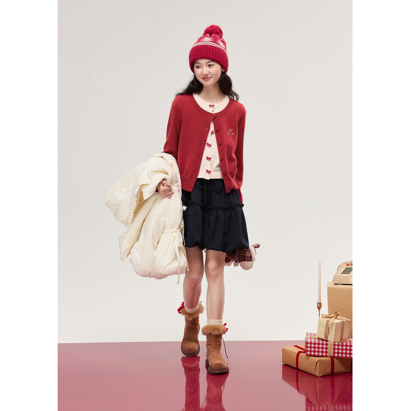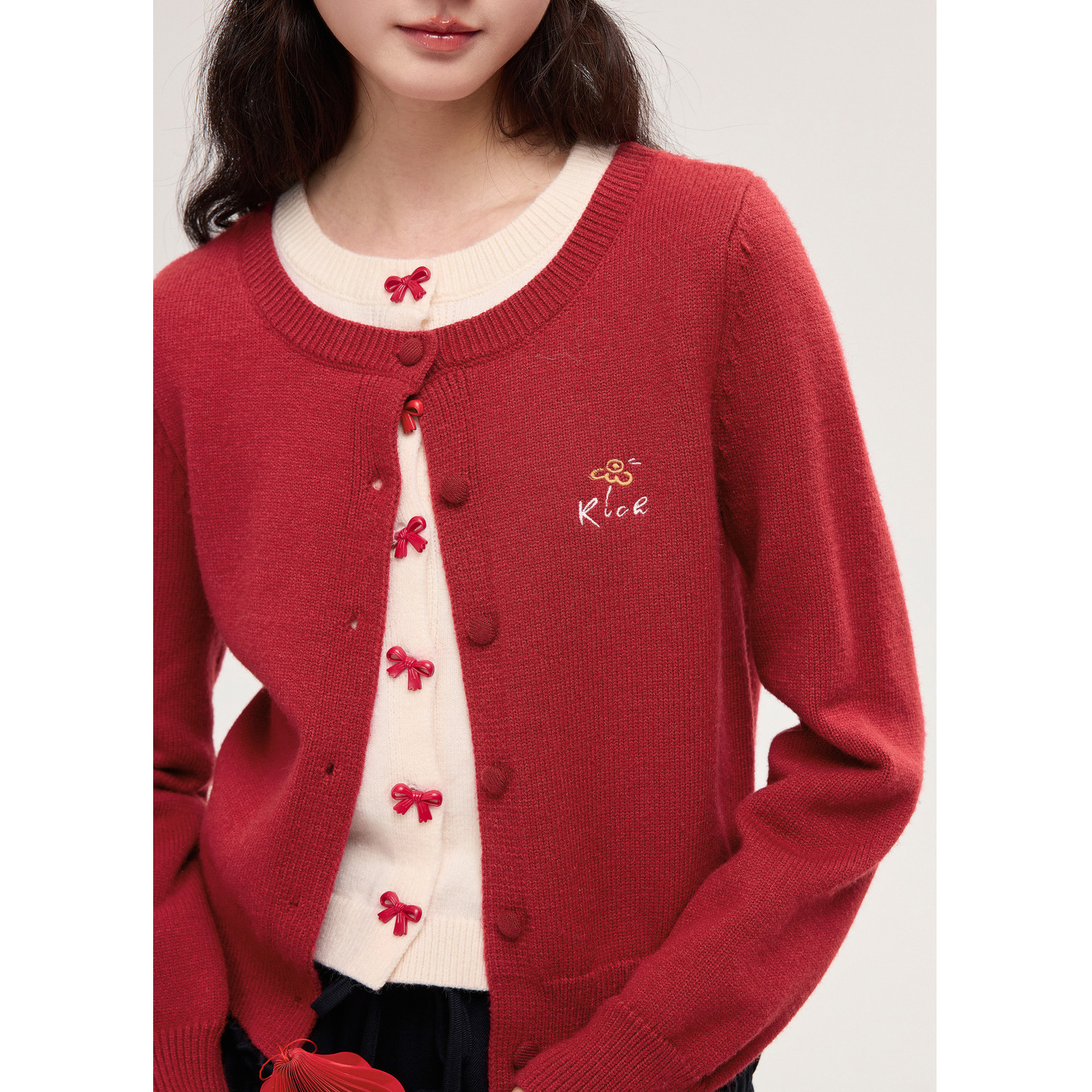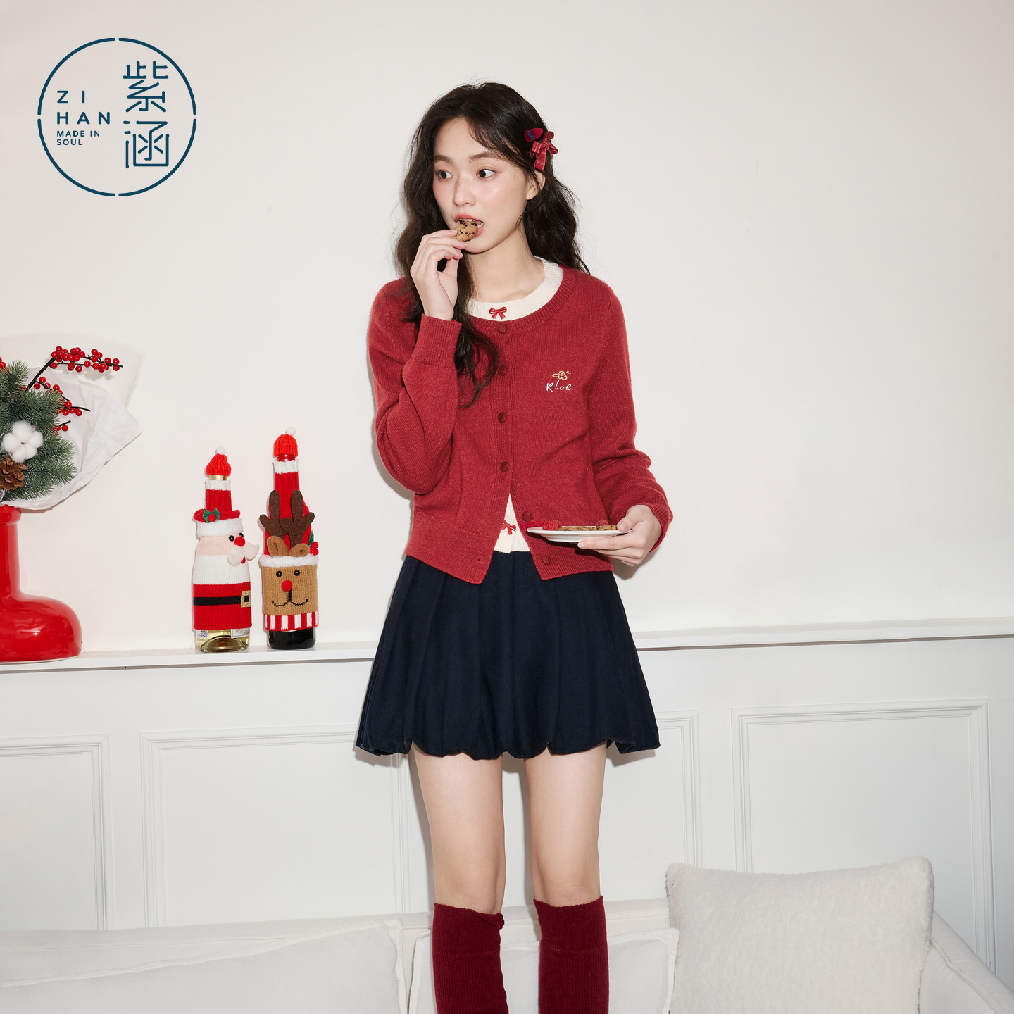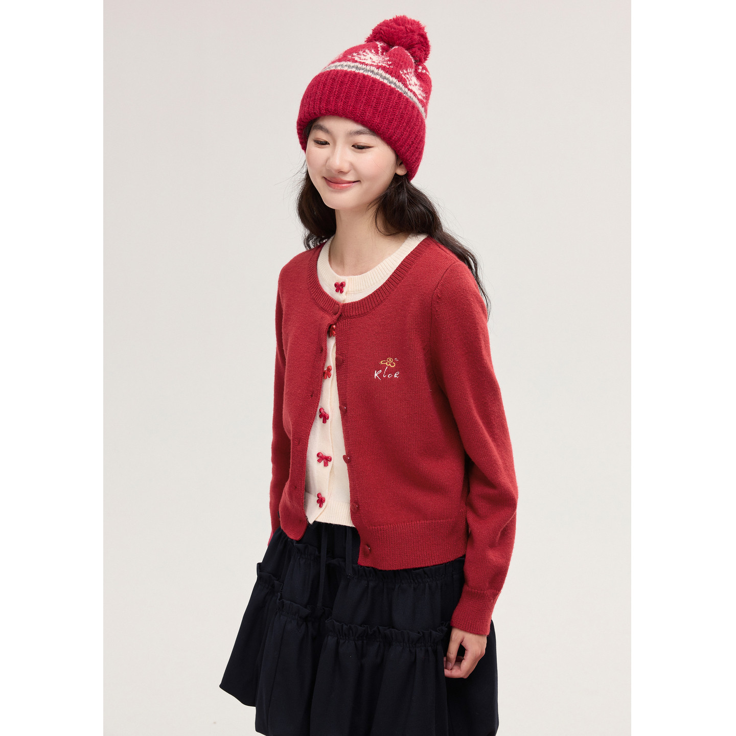 紫涵红色假两件针织开衫短款双层半身裙两件套装女2025年冬季新款