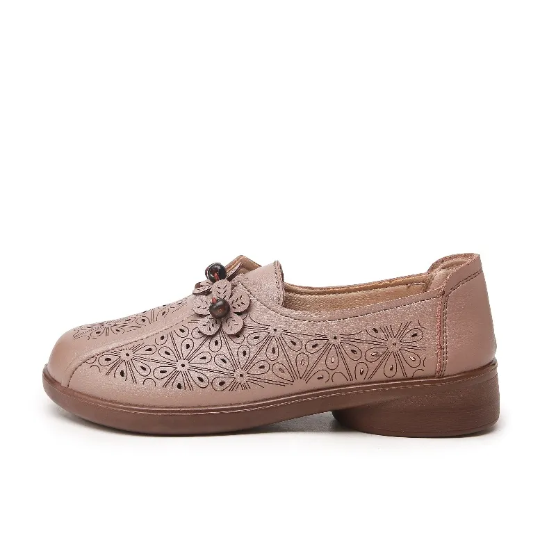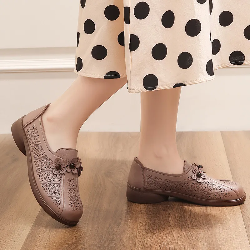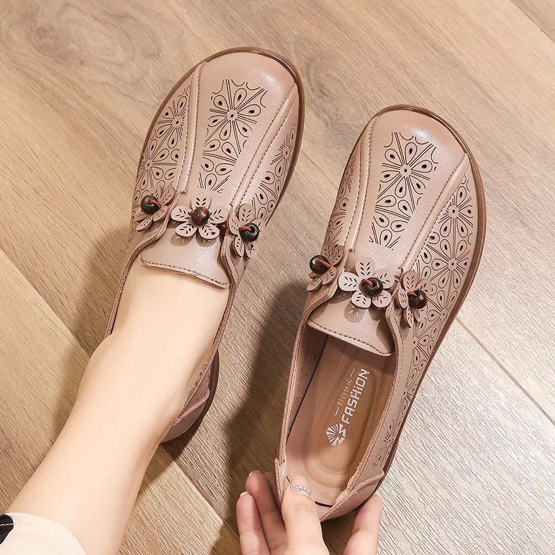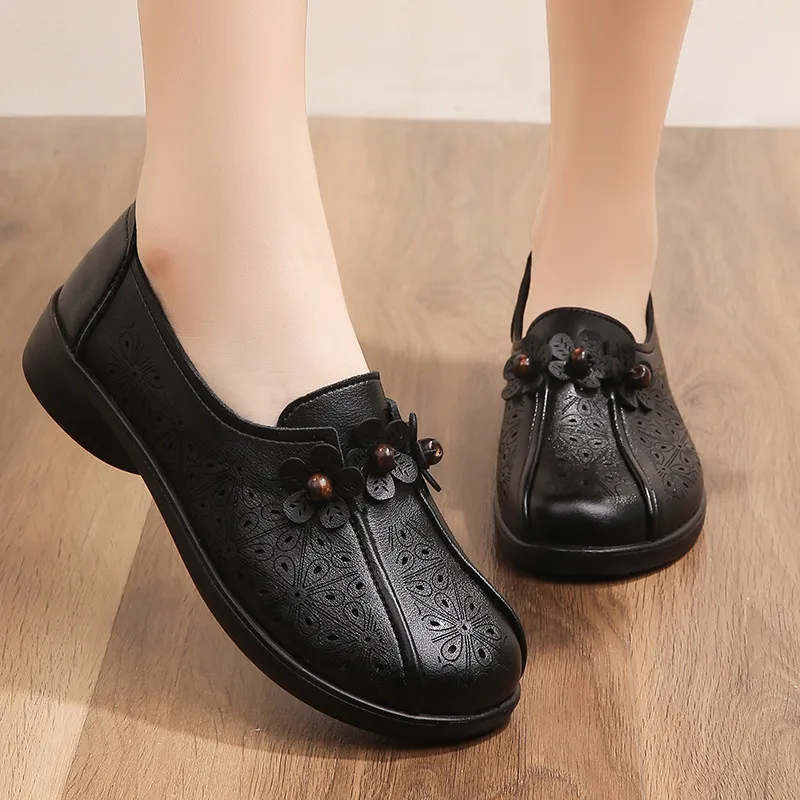 夏季真皮老人妈妈鞋凉鞋真皮软底镂空中老年皮鞋平底洞洞鞋舒适