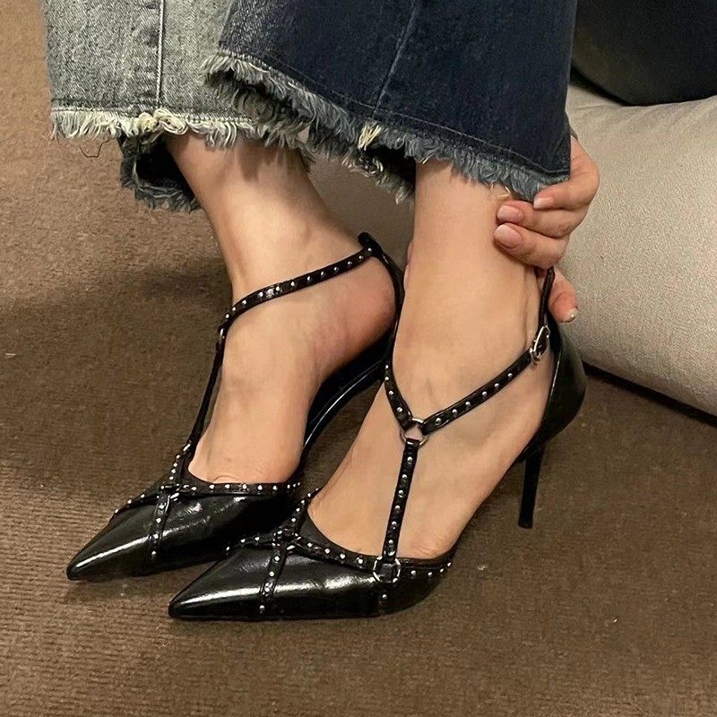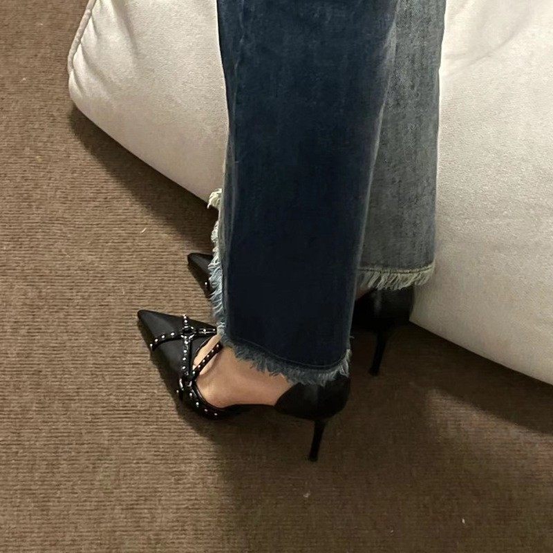 铆钉高跟鞋女2025年春季新款欧美朋克风凉鞋包头细跟尖头时尚单鞋