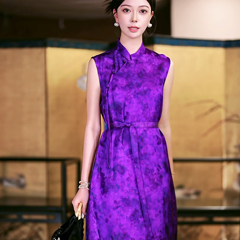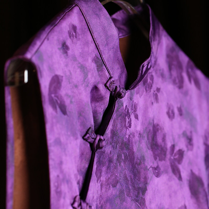 复古日记“枫叶蝶”手工打籽盘扣半开襟桑蚕丝提花旗袍裙25FL607