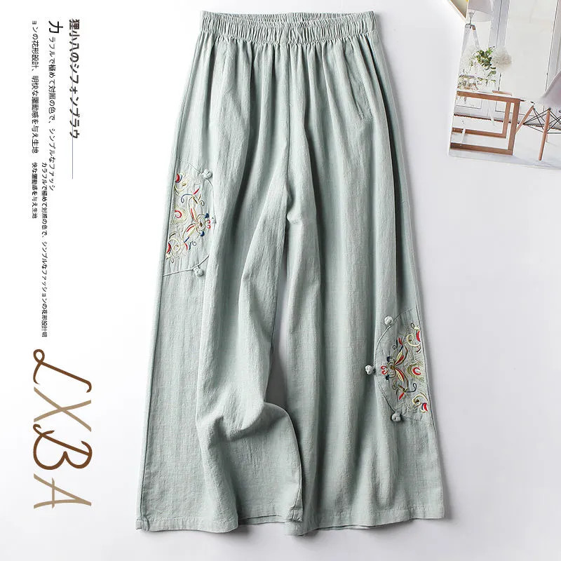 棉麻休闲裤女裤春夏薄款复古民族风刺绣阔腿裤百搭显瘦九分裤女