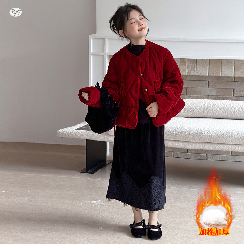 女童拜年服套装2025年冬季新款中大童加棉短款棉服裙子两件套时髦