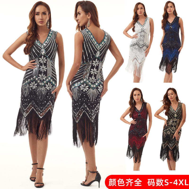 女式复古礼服裙宴会轻奢鸡尾酒派对亮片流苏晚礼服-
