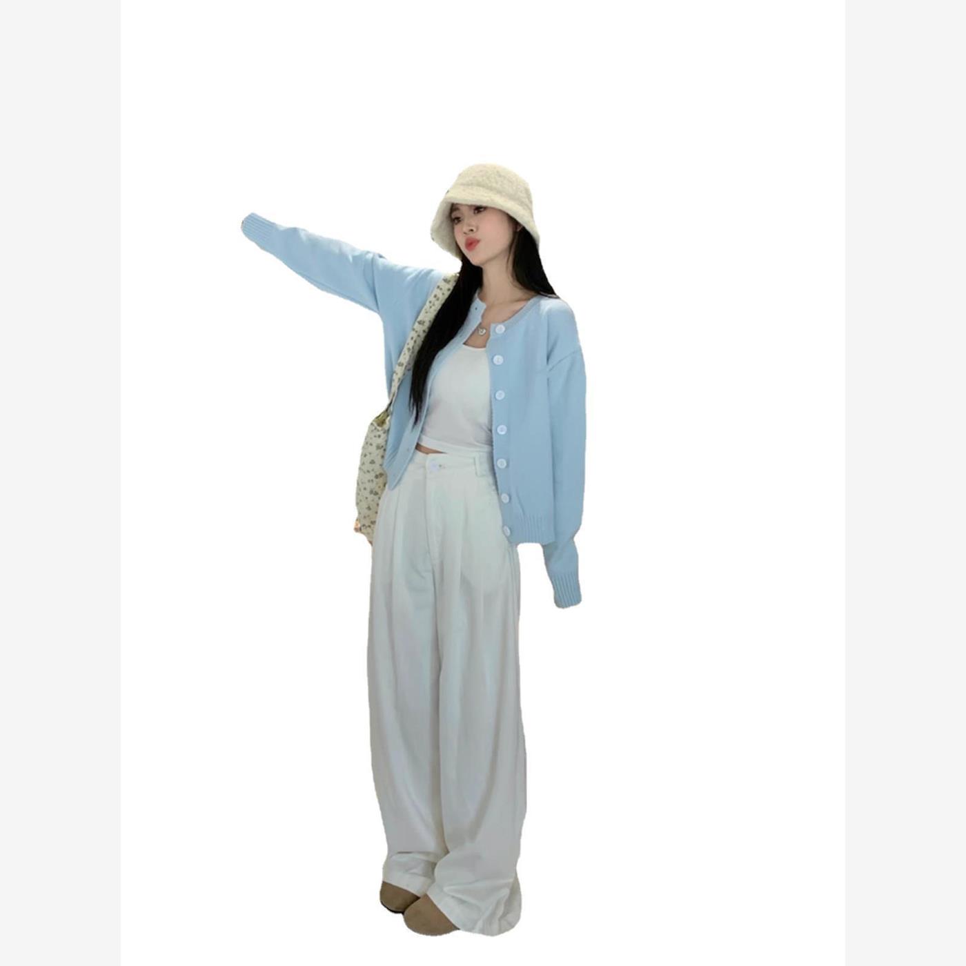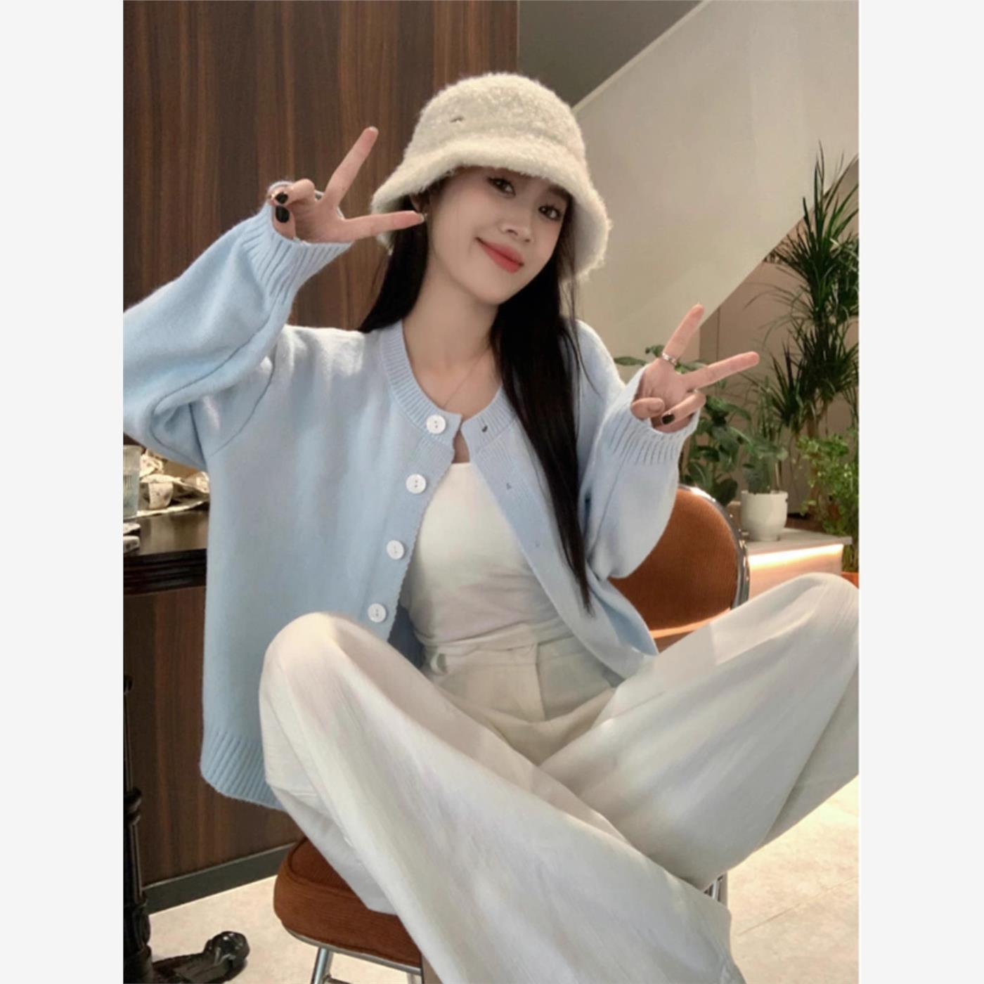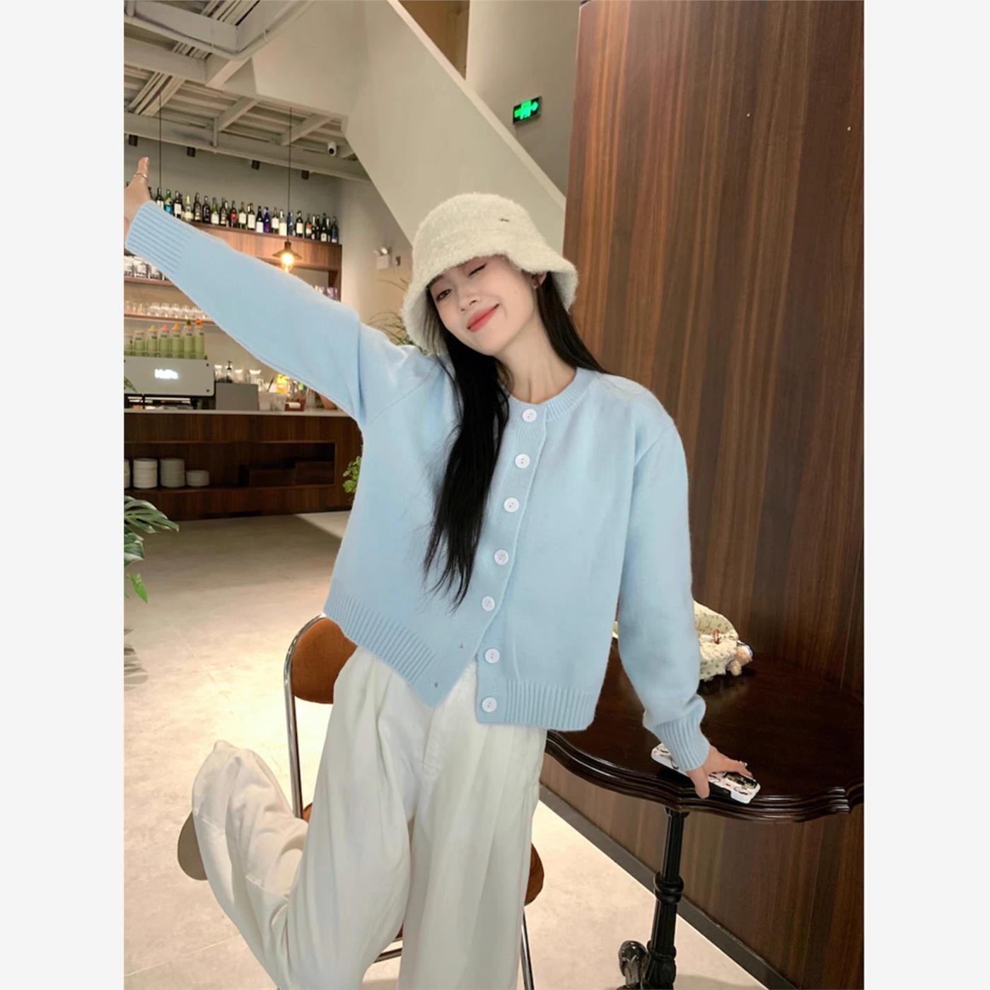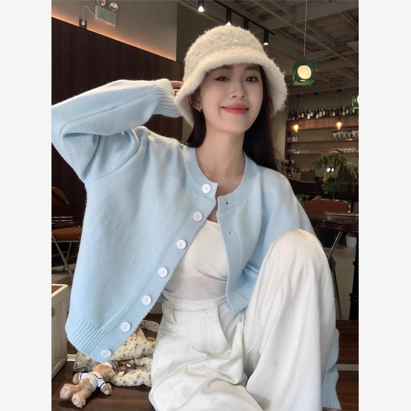 浅蓝色长袖针织衫女秋季款温柔风奶系软糯宽松短款开衫毛衣外套女