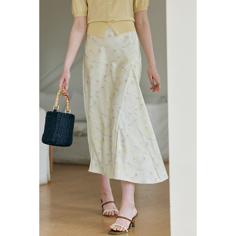 HeyDress黄色印花半身裙女夏季法式浪漫缎面半裙高级气质垂感裙子
