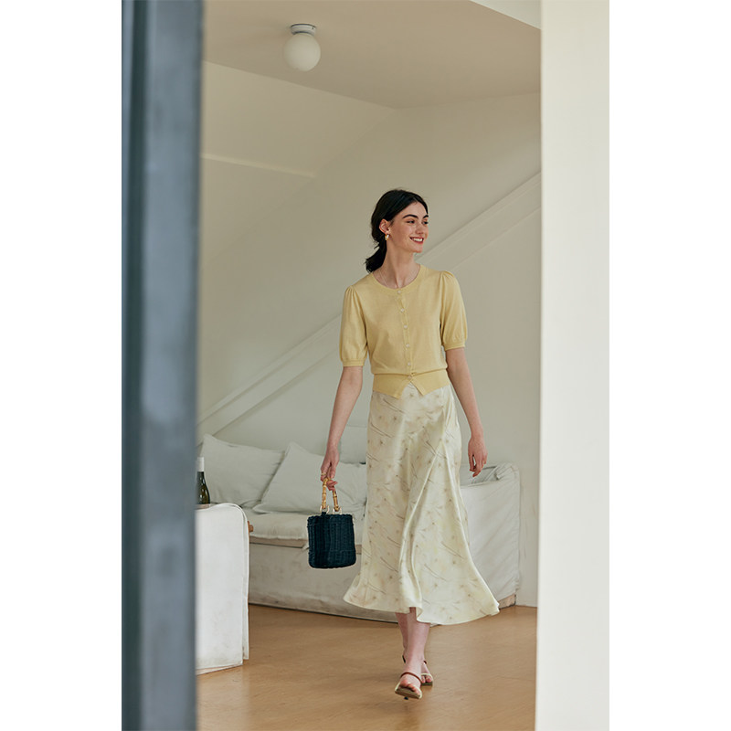 HeyDress法式垂感黄色印花半身裙