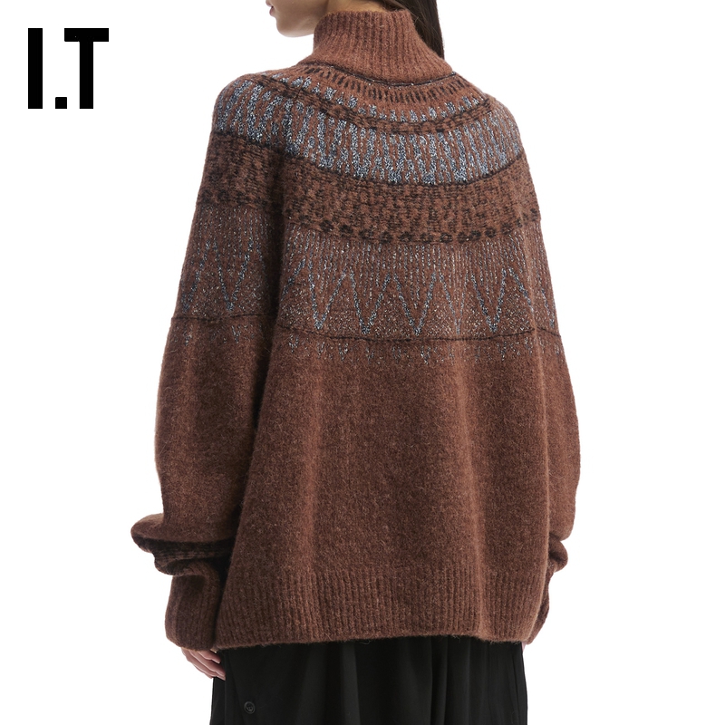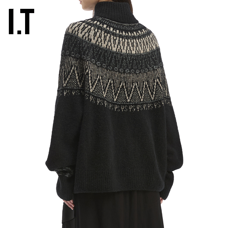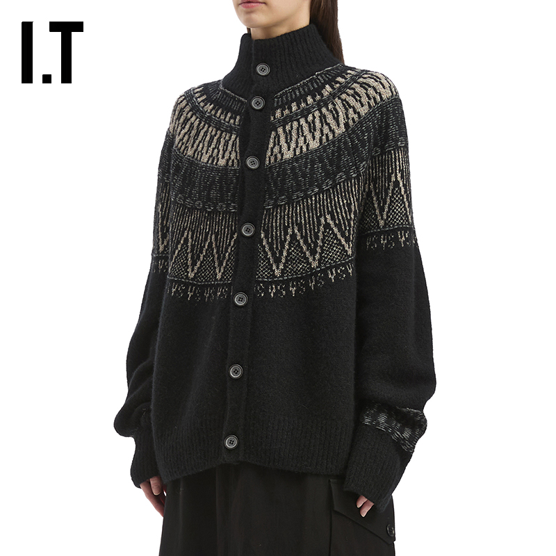 IT Y's女装宽松立领针织开衫新款复古文艺花色毛衣外套K27584XP